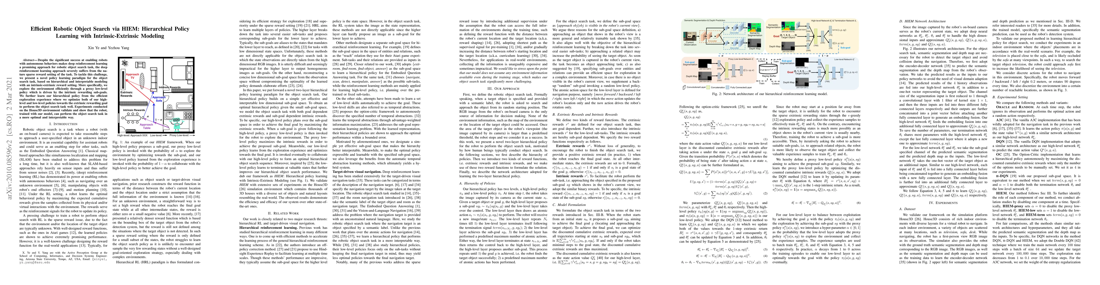 Despite the significant success at enabling robots with autonomous behaviors makes deep reinforcement learning a promising approach for robotic object search task, the deep reinforcement learning approach severely suffers from the nature sparse reward setting of the task. To tackle this challenge, we present a novel policy learning paradigm for the object search task, based on hierarchical and interpretable modeling with an intrinsic-extrinsic reward setting. More specifically, we explore the environment efficiently through a proxy low-level policy which is driven by the intrinsic rewarding sub-goals. We further learn our hierarchical policy from the efficient exploration experience where we optimize both of our high-level and low-level policies towards the extrinsic rewarding goal to perform the object search task well. Experiments conducted on the House3D environment validate and show that the robot, trained with our model, can perform the object search task in a more optimal and interpretable way.