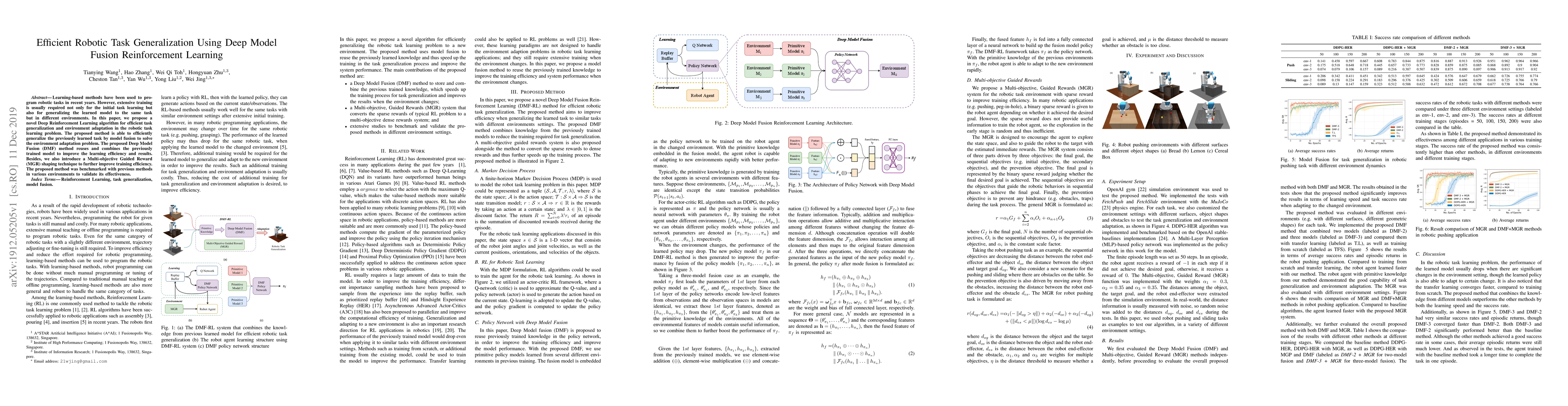 This paper proposes a Deep Reinforcement Learning algorithm with Deep Model Fusion (DMF) to efficiently generalize robotic task learning across different environments. It also introduces a Multi-objective Guided Reward (MGR) shaping technique to enhance training efficiency, demonstrating effectiveness through benchmarking against previous methods.