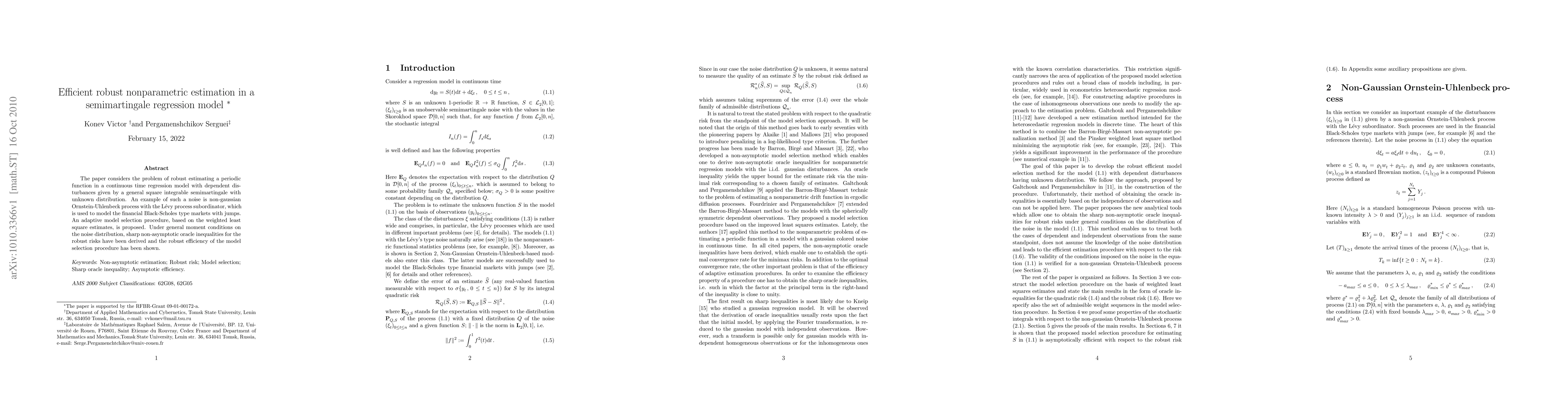 The paper considers the problem of robust estimating a periodic function in a continuous time regression model with dependent disturbances given by a general square integrable semimartingale with unknown distribution. An example of such a noise is non-gaussian Ornstein-Uhlenbeck process with the L\'evy process subordinator, which is used to model the financial Black-Scholes type markets with jumps. An adaptive model selection procedure, based on the weighted least square estimates, is proposed. Under general moment conditions on the noise distribution, sharp non-asymptotic oracle inequalities for the robust risks have been derived and the robust efficiency of the model selection procedure has been shown.