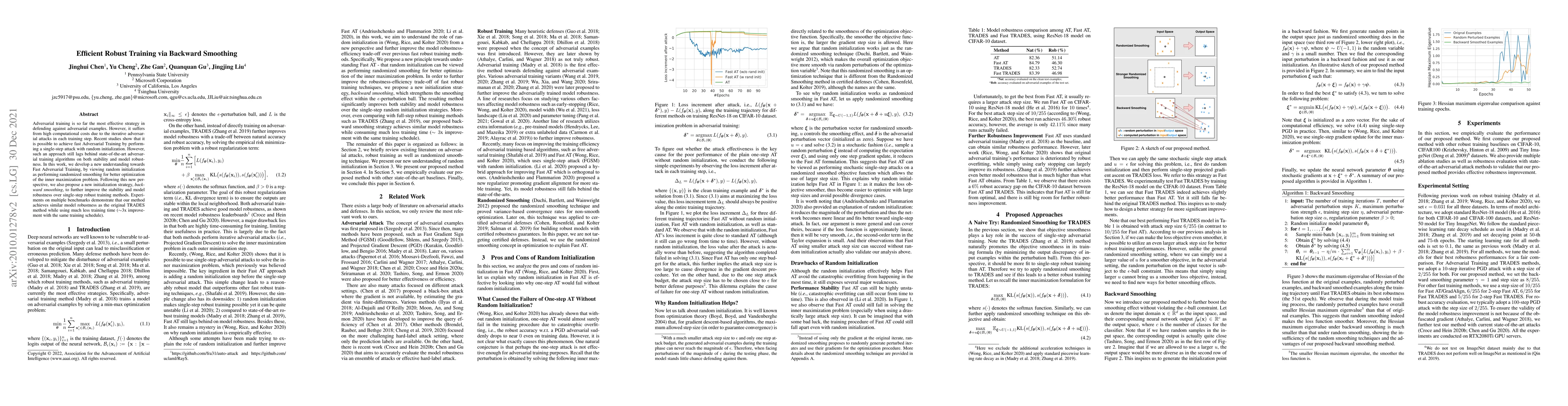 Adversarial training is so far the most effective strategy in defending against adversarial examples. However, it suffers from high computational costs due to the iterative adversarial attacks in each training step. Recent studies show that it is possible to achieve fast Adversarial Training by performing a single-step attack with random initialization. However, such an approach still lags behind state-of-the-art adversarial training algorithms on both stability and model robustness. In this work, we develop a new understanding towards Fast Adversarial Training, by viewing random initialization as performing randomized smoothing for better optimization of the inner maximization problem. Following this new perspective, we also propose a new initialization strategy, backward smoothing, to further improve the stability and model robustness over single-step robust training methods. Experiments on multiple benchmarks demonstrate that our method achieves similar model robustness as the original TRADES method while using much less training time ($\sim$3x improvement with the same training schedule).