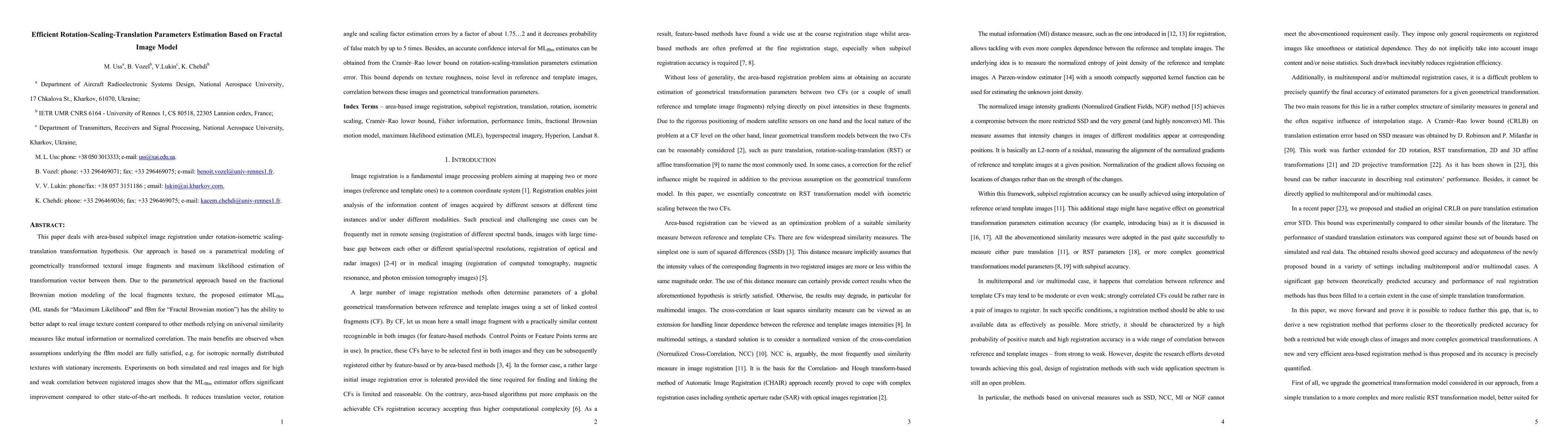 This paper proposes a maximum likelihood estimator (MLfBm) for subpixel image registration based on the fractal Brownian motion model, which significantly improves the accuracy of rotation-scaling-translation parameter estimation compared to traditional methods. The MLfBm estimator reduces estimation errors by up to a factor of 2 and decreases the probability of false matches by up to 5 times.