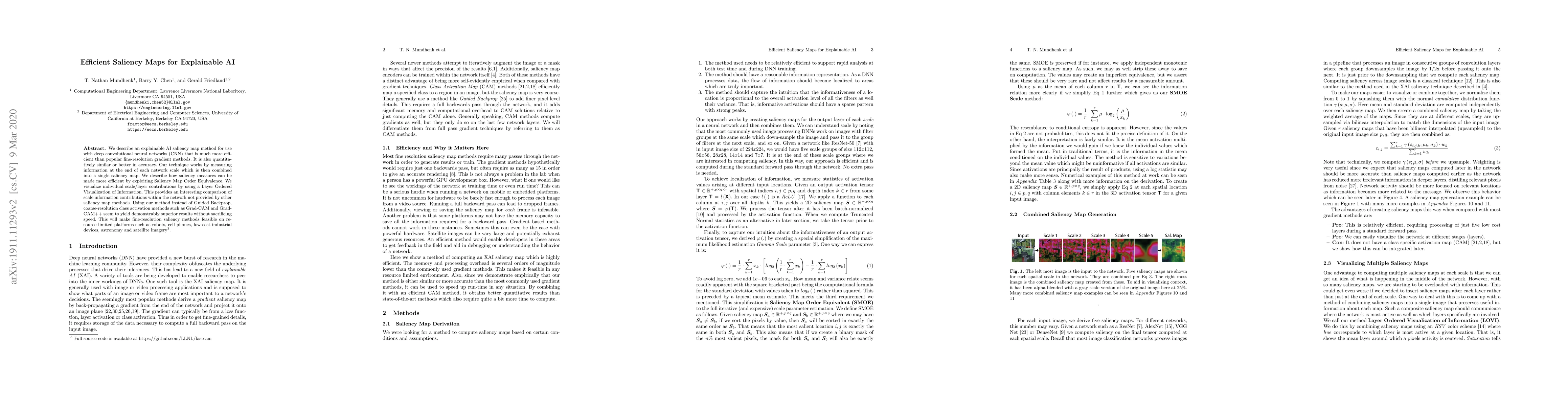 We describe an explainable AI saliency map method for use with deep convolutional neural networks (CNN) that is much more efficient than popular fine-resolution gradient methods. It is also quantitatively similar or better in accuracy. Our technique works by measuring information at the end of each network scale which is then combined into a single saliency map. We describe how saliency measures can be made more efficient by exploiting Saliency Map Order Equivalence. We visualize individual scale/layer contributions by using a Layer Ordered Visualization of Information. This provides an interesting comparison of scale information contributions within the network not provided by other saliency map methods. Using our method instead of Guided Backprop, coarse-resolution class activation methods such as Grad-CAM and Grad-CAM++ seem to yield demonstrably superior results without sacrificing speed. This will make fine-resolution saliency methods feasible on resource limited platforms such as robots, cell phones, low-cost industrial devices, astronomy and satellite imagery.