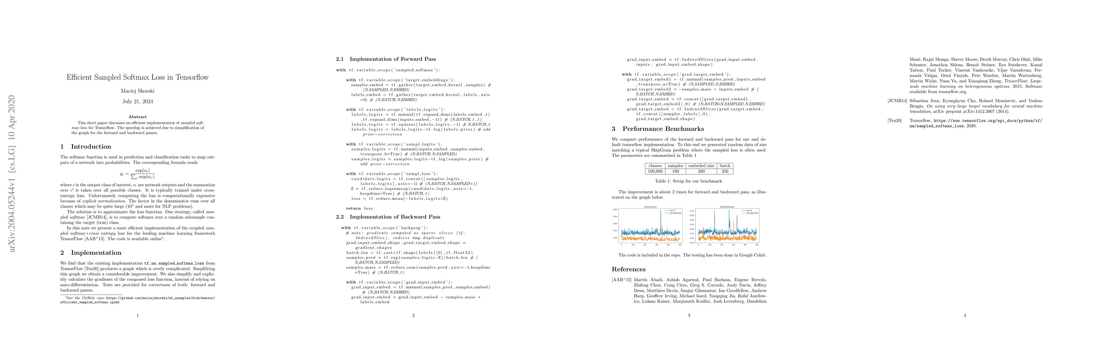 Summary: This paper presents an optimized Tensorflow implementation of sampled softmax loss, achieving significant speedup through simplified forward and backward pass graphs. The approach enhances computational efficiency compared to the default Tensorflow implementation.