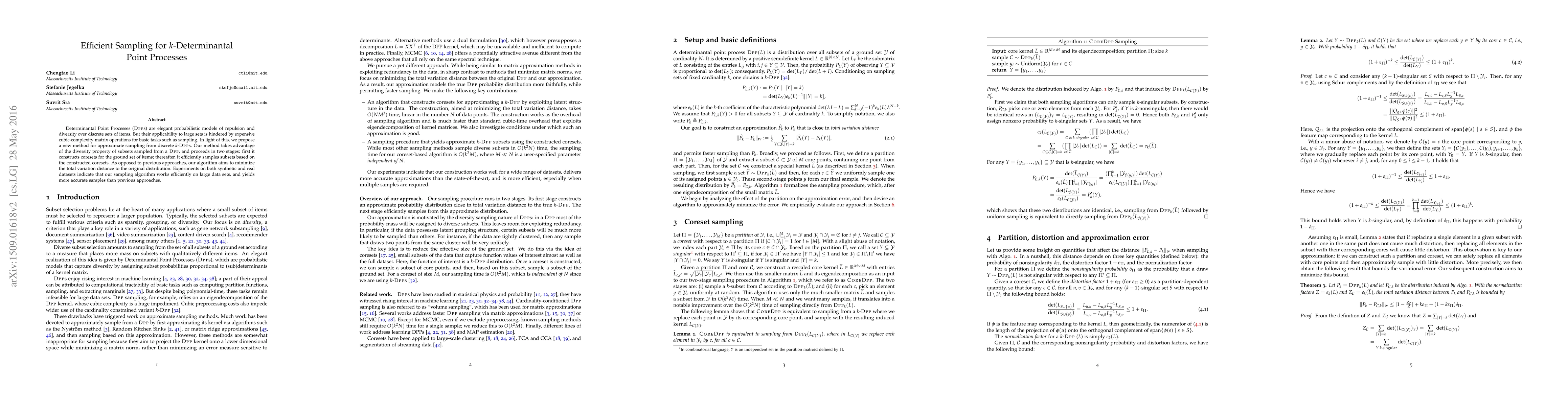 This paper proposes an efficient sampling method for large k-Determinantal Point Processes (DPPs) that minimizes the total variation distance to the original distribution. The method constructs coresets for the item set and samples subsets based on these coresets, achieving better accuracy compared to previous approaches.