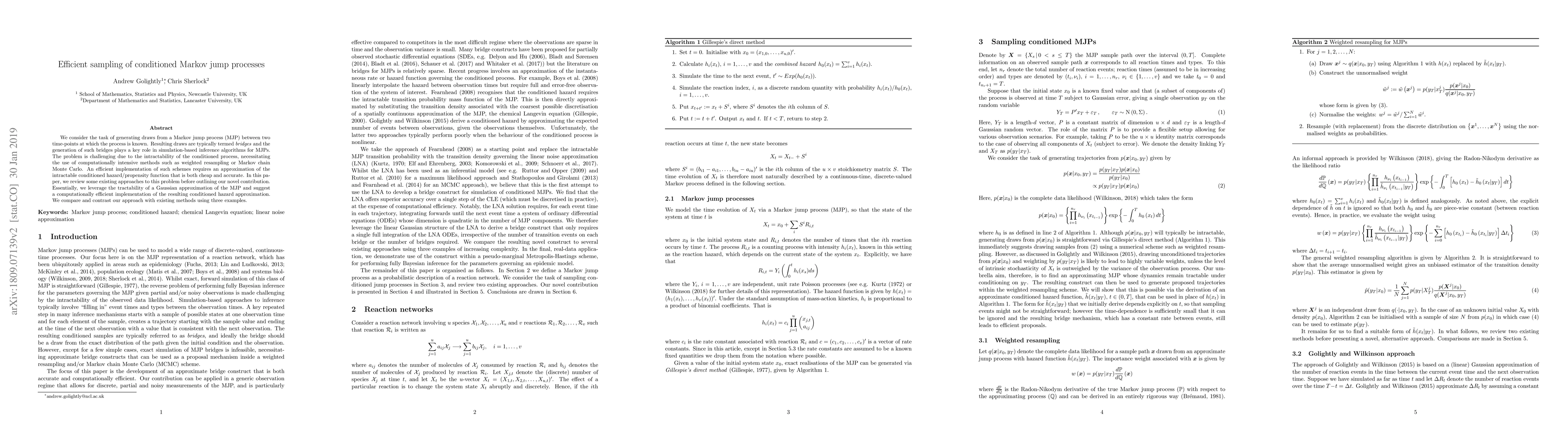 This paper proposes a novel, efficient method for generating conditioned Markov jump process bridges by leveraging a Gaussian approximation of the process, offering a computationally cheaper and accurate alternative to existing weighted resampling or Markov chain Monte Carlo techniques. The authors compare their approach with existing methods through three examples.