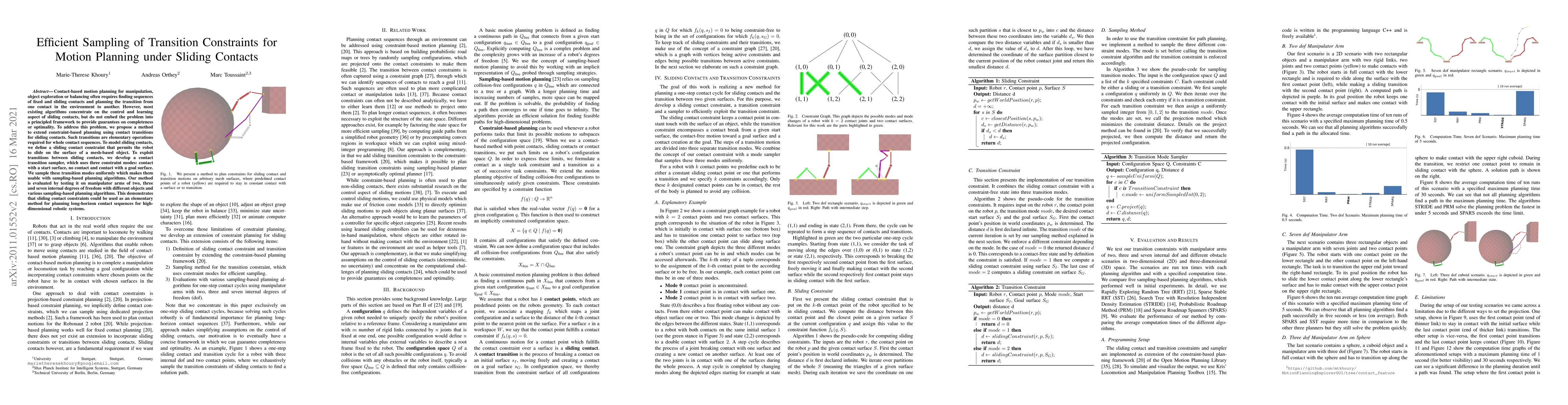 Contact-based motion planning for manipulation, object exploration or balancing often requires finding sequences of fixed and sliding contacts and planning the transition from one contact in the environment to another. However, most existing algorithms concentrate on the control and learning aspect of sliding contacts, but do not embed the problem into a principled framework to provide guarantees on completeness or optimality. To address this problem, we propose a method to extend constraint-based planning using contact transitions for sliding contacts. Such transitions are elementary operations required for whole contact sequences. To model sliding contacts, we define a sliding contact constraint that permits the robot to slide on the surface of a mesh-based object. To exploit transitions between sliding contacts, we develop a contact transition sampler, which uses three constraint modes: contact with a start surface, no contact and contact with a goal surface. We sample these transition modes uniformly which makes them usable with sampling-based planning algorithms. Our method is evaluated by testing it on manipulator arms of two, three and seven internal degrees of freedom with different objects and various sampling-based planning algorithms. This demonstrates that sliding contact constraints could be used as an elementary method for planning long-horizon contact sequences for high-dimensional robotic systems.