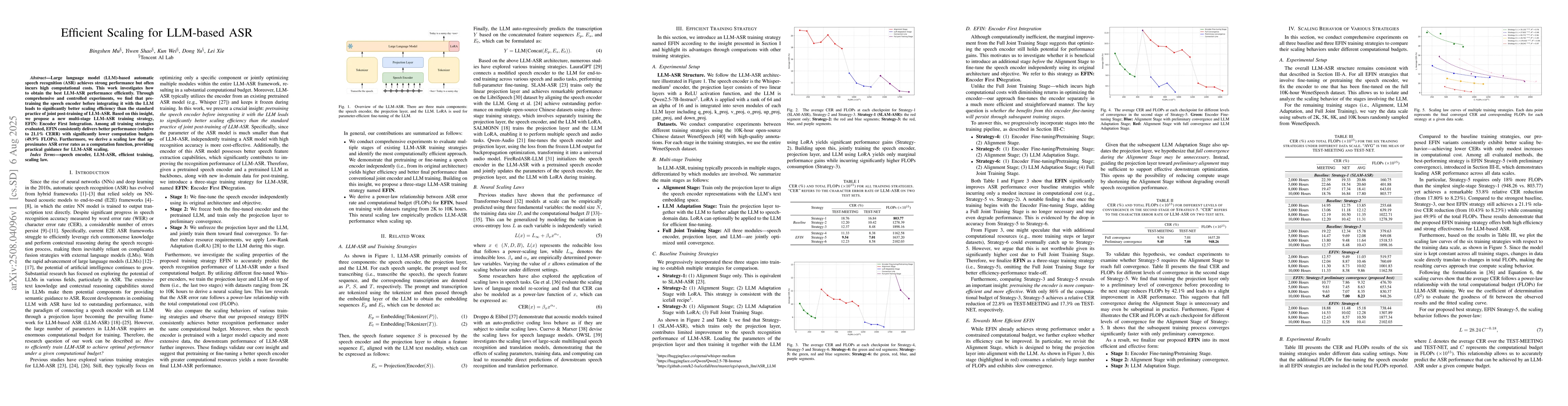 Large language model (LLM)-based automatic speech recognition (ASR) achieves strong performance but often incurs high computational costs. This work investigates how to obtain the best LLM-ASR performance efficiently. Through comprehensive and controlled experiments, we find that pretraining the speech encoder before integrating it with the LLM leads to significantly better scaling efficiency than the standard practice of joint post-training of LLM-ASR. Based on this insight, we propose a new multi-stage LLM-ASR training strategy, EFIN: Encoder First Integration. Among all training strategies evaluated, EFIN consistently delivers better performance (relative to 21.1% CERR) with significantly lower computation budgets (49.9% FLOPs). Furthermore, we derive a scaling law that approximates ASR error rates as a computation function, providing practical guidance for LLM-ASR scaling.