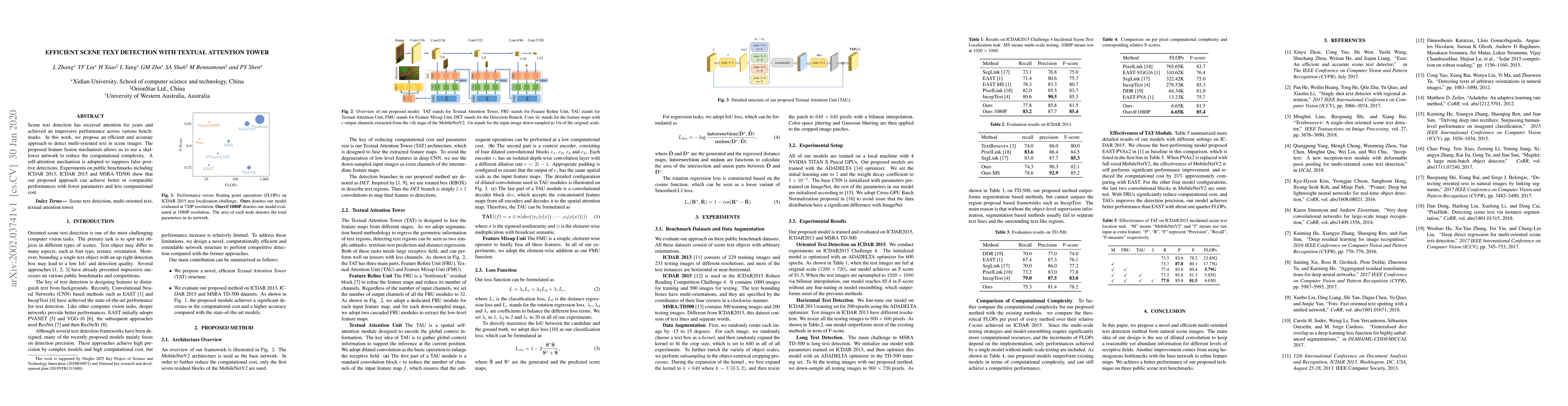 This paper proposes an efficient scene text detection method using a feature fusion mechanism and a self-attention tower to reduce computational complexity and suppress false positives. Experimental results demonstrate improved or competitive performance on benchmarks with fewer parameters and lower computational cost.