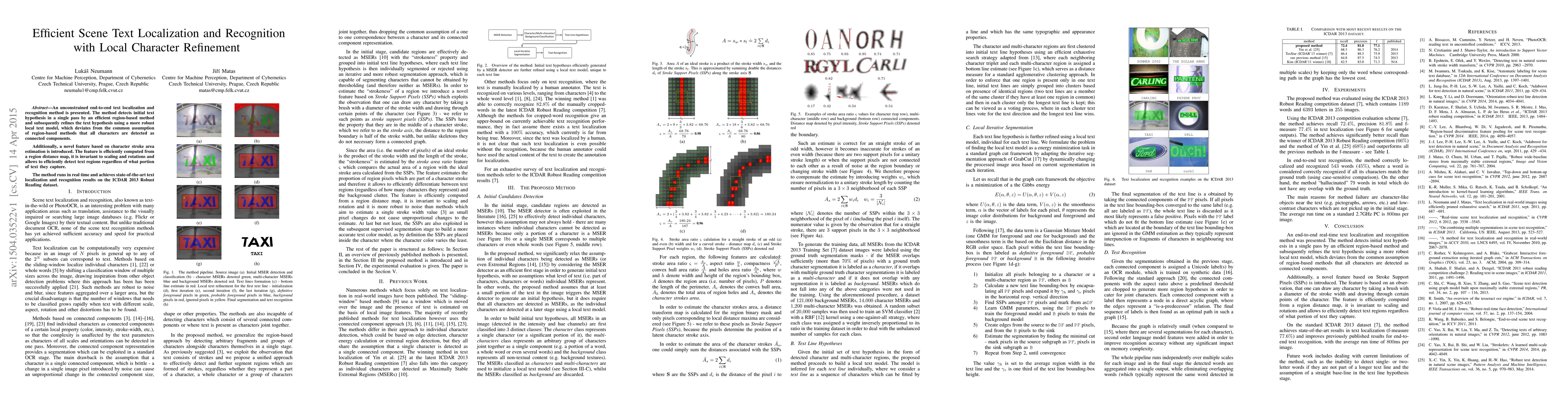 A new method for scene text localization and recognition uses a region-based approach to detect initial text hypotheses and then refines them with a more robust local text model. The method achieves state-of-the-art results on the ICDAR 2013 Robust Reading dataset in real time.
