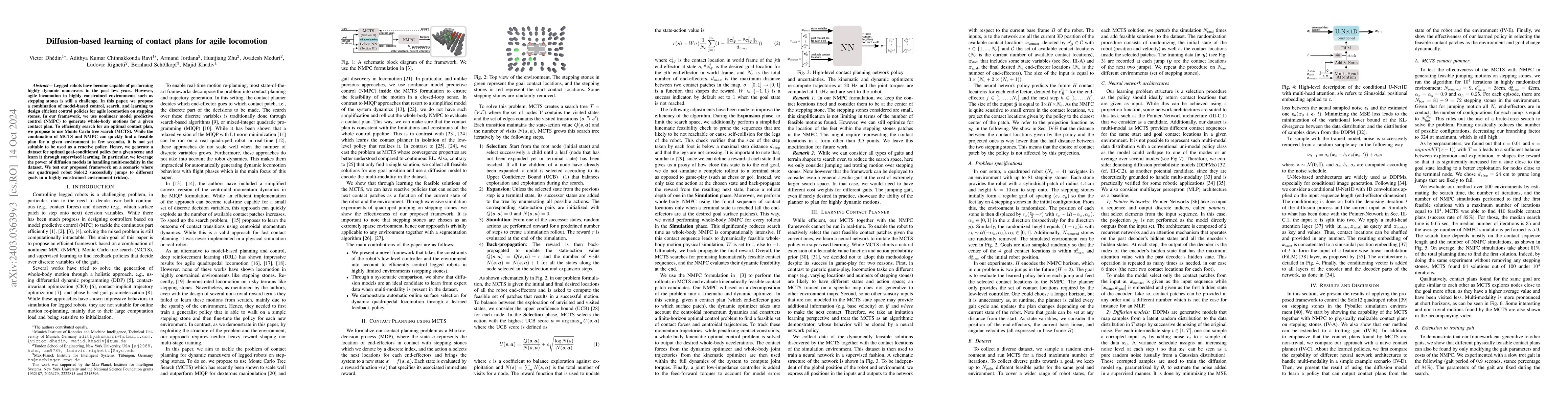 This paper proposes a framework combining model-based control, search, and learning for agile locomotion of legged robots on stepping stones. It uses nonlinear model predictive control (NMPC) with Monte Carlo tree search (MCTS) and supervised learning with diffusion models to efficiently navigate constrained environments. The framework is demonstrated on a quadruped robot successfully jumping to goals.