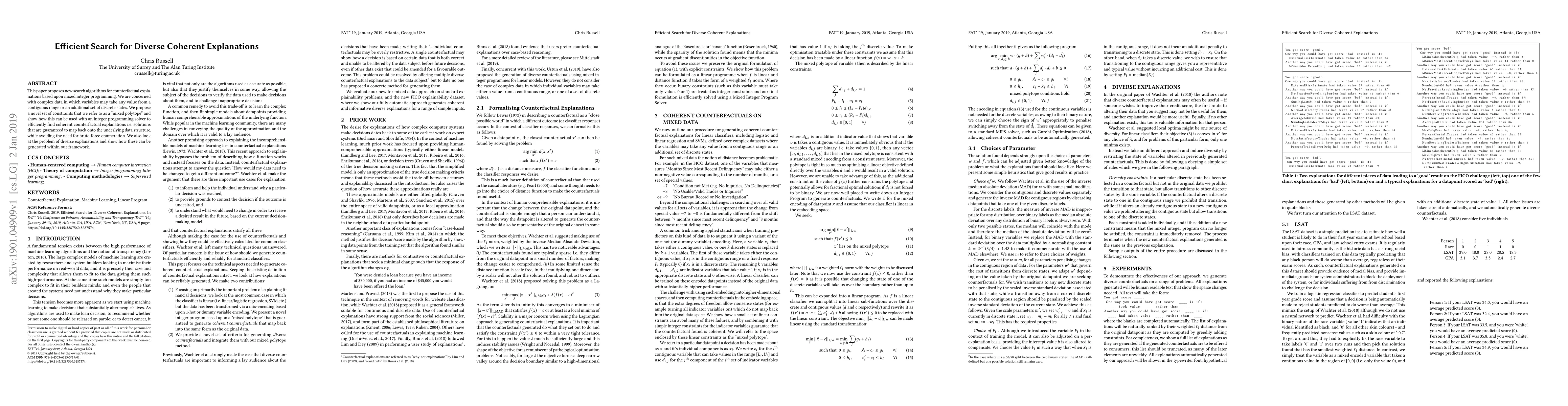This paper proposes new search algorithms for counterfactual explanations based upon mixed integer programming. We are concerned with complex data in which variables may take any value from a contiguous range or an additional set of discrete states. We propose a novel set of constraints that we refer to as a "mixed polytope" and show how this can be used with an integer programming solver to efficiently find coherent counterfactual explanations i.e. solutions that are guaranteed to map back onto the underlying data structure, while avoiding the need for brute-force enumeration. We also look at the problem of diverse explanations and show how these can be generated within our framework.