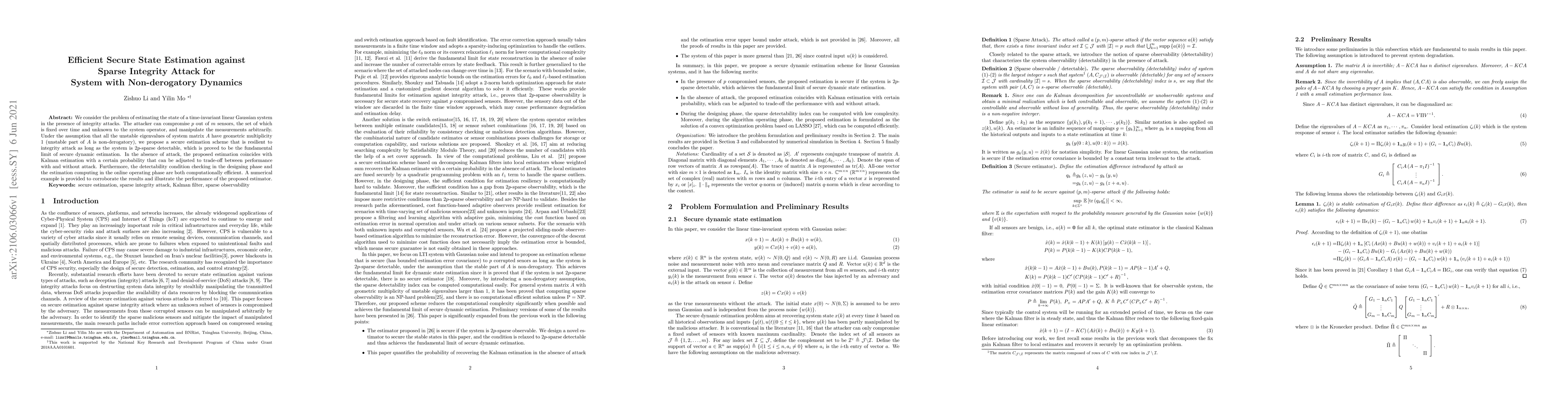 We consider the problem of estimating the state of a time-invariant linear Gaussian system in the presence of integrity attacks. The attacker can compromise $p$ out of $m$ sensors, the set of which is fixed over time and unknown to the system operator, and manipulate the measurements arbitrarily. Under the assumption that all the unstable eigenvalues of system matrix $A$ have geometric multiplicity 1 (unstable part of $A$ is non-derogatory), we propose a secure estimation scheme that is resilient to integrity attack as long as the system is $2p$-sparse detectable, which is proved to be the fundamental limit of secure dynamic estimation. In the absence of attack, the proposed estimation coincides with Kalman estimation with a certain probability that can be adjusted to trade-off between performance with and without attack. Furthermore, the detectability condition checking in the designing phase and the estimation computing in the online operating phase are both computationally efficient. A numerical example is provided to corroborate the results and illustrate the performance of the proposed estimator.