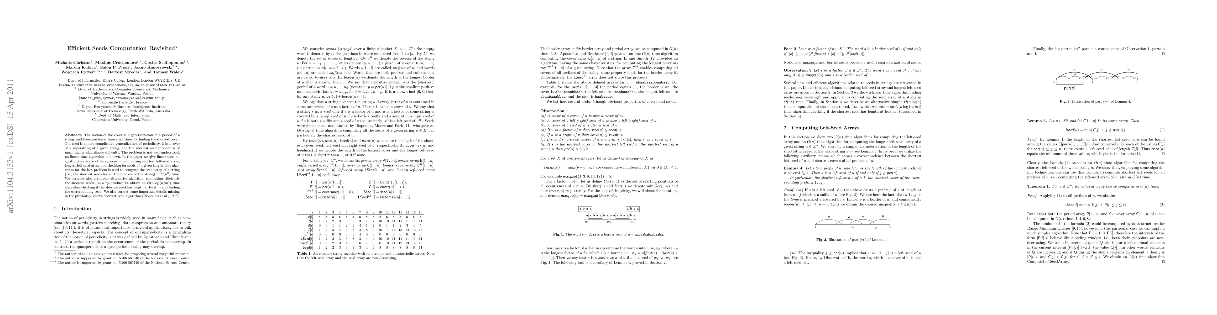 The notion of the cover is a generalization of a period of a string, and there are linear time algorithms for finding the shortest cover. The seed is a more complicated generalization of periodicity, it is a cover of a superstring of a given string, and the shortest seed problem is of much higher algorithmic difficulty. The problem is not well understood, no linear time algorithm is known. In the paper we give linear time algorithms for some of its versions --- computing shortest left-seed array, longest left-seed array and checking for seeds of a given length. The algorithm for the last problem is used to compute the seed array of a string (i.e., the shortest seeds for all the prefixes of the string) in $O(n^2)$ time. We describe also a simpler alternative algorithm computing efficiently the shortest seeds. As a by-product we obtain an $O(n\log{(n/m)})$ time algorithm checking if the shortest seed has length at least $m$ and finding the corresponding seed. We also correct some important details missing in the previously known shortest-seed algorithm (Iliopoulos et al., 1996).