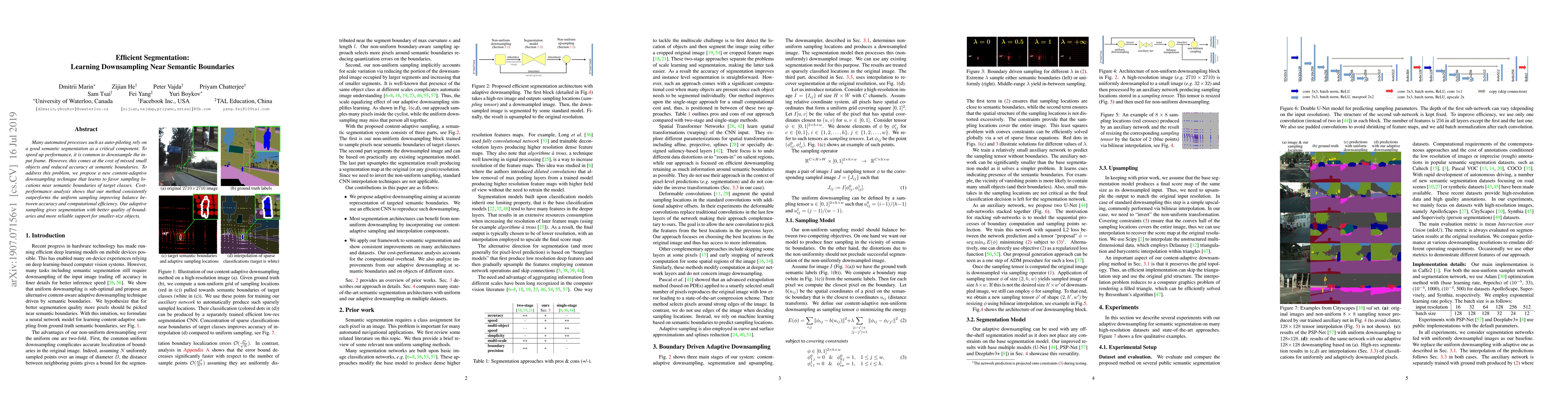 This paper proposes a content-adaptive downsampling technique that prioritizes sampling near semantic boundaries to improve the accuracy and efficiency of semantic segmentation. The method outperforms uniform sampling, achieving a better balance between accuracy and computational efficiency while enhancing boundary quality and support for small objects.