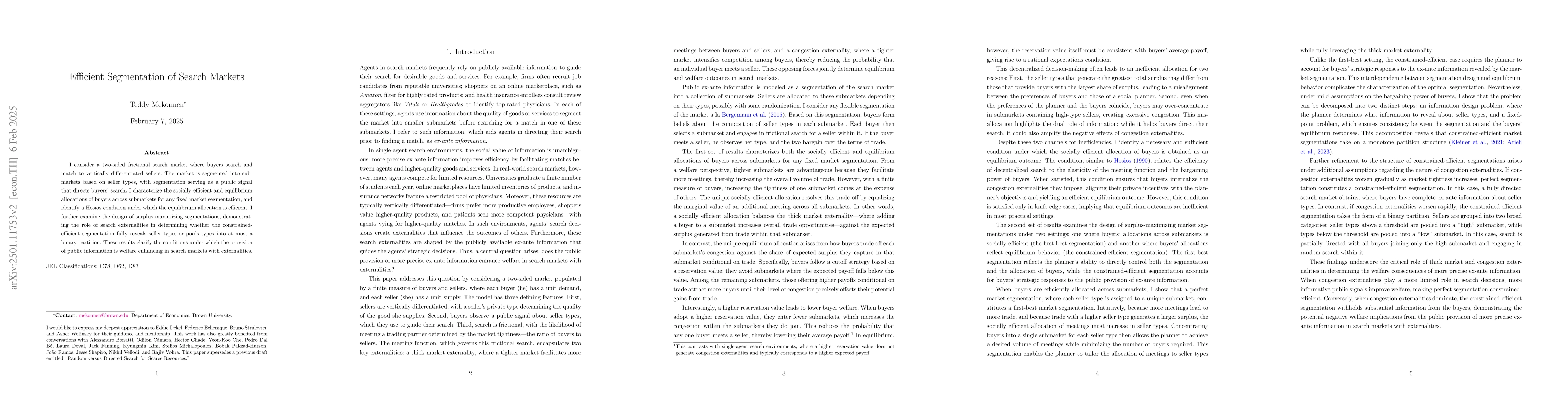 This paper analyzes efficient segmentation in a frictional search market with vertically differentiated sellers, identifying conditions for socially efficient and equilibrium allocations. It finds that under certain conditions, equilibrium allocations are efficient, and explores how congestion externalities influence the design of segmentations that maximize surplus.
