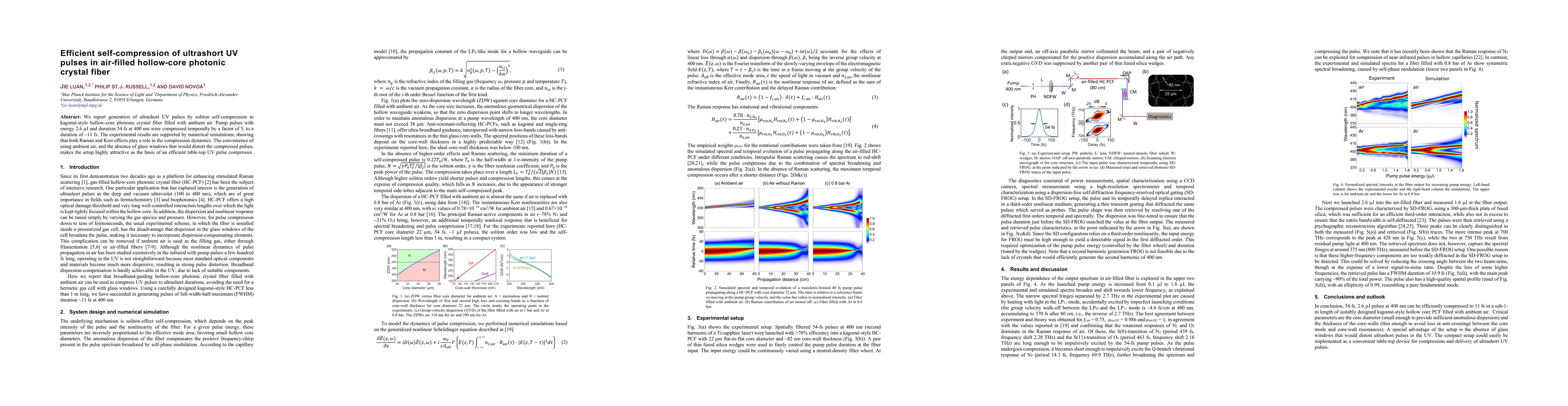 This paper describes the generation of ultrashort UV pulses via soliton self-compression in an air-filled hollow-core photonic crystal fiber, achieving a temporal compression factor of 5. The use of ambient air and the absence of distorting glass windows make the setup an efficient table-top UV pulse compressor.