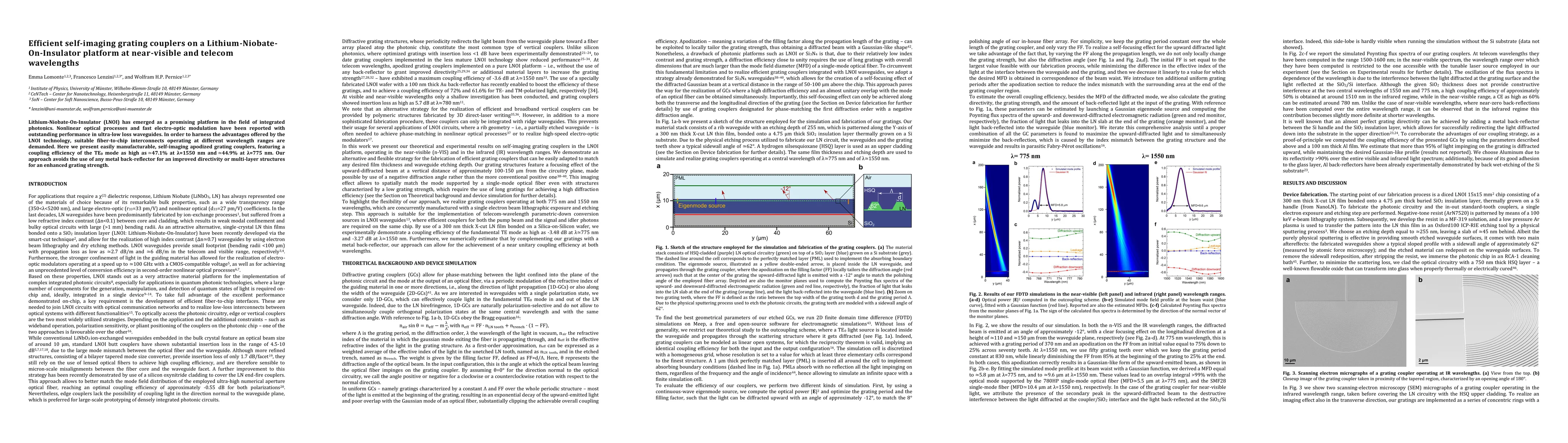 Title: Efficient self-imaging grating couplers on a Lithium-Niobate-On-Insulator platform at near-visible and telecom wavelengths Summary: This paper presents self-imaging grating couplers on a LNOI platform, demonstrating high coupling efficiency of TE0 mode (47.1% at 1550 nm and 44.9% at 775 nm) without using metal back-reflectors or multi-layer structures.