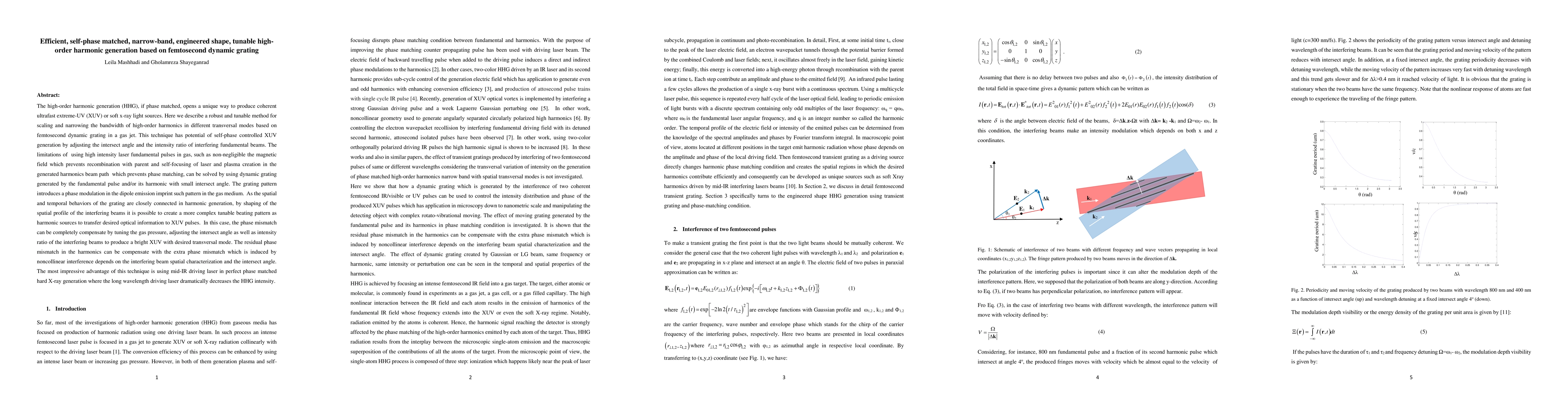 This paper presents a method for efficient, scalable, and tunable high-order harmonic generation using femtosecond dynamic grating in gas jets, enabling narrow-band, self-phase matched extreme-UV light sources. The technique compensates for phase mismatch by adjusting the intersect angle and intensity ratio of the interfering beams, overcoming limitations of high-intensity laser pulses.