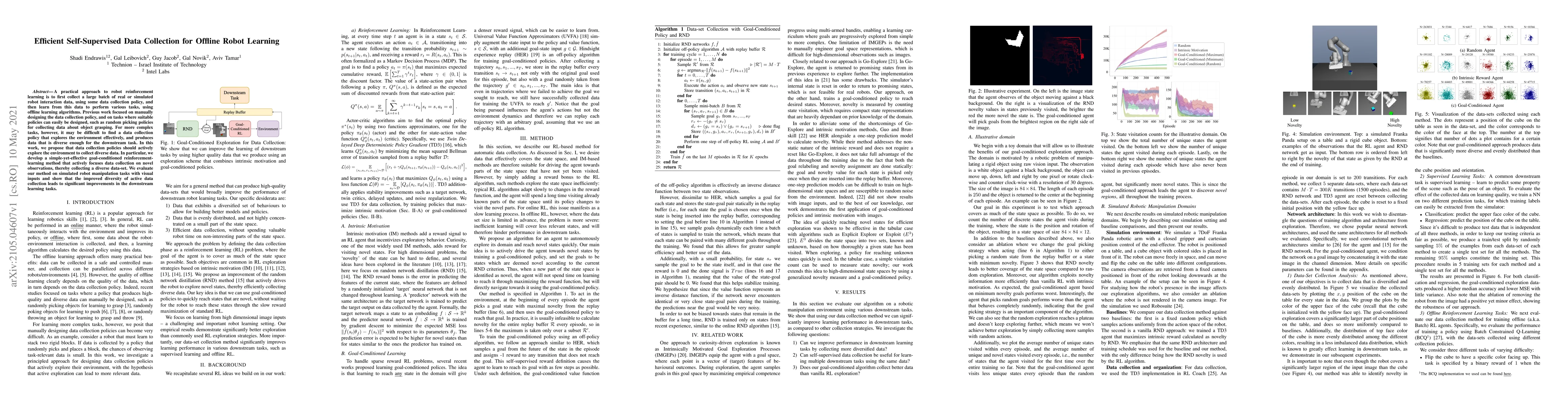 The paper proposes a self-supervised data collection method for offline robot learning, combining intrinsic motivation with goal-conditioned reinforcement learning to efficiently cover novel states.