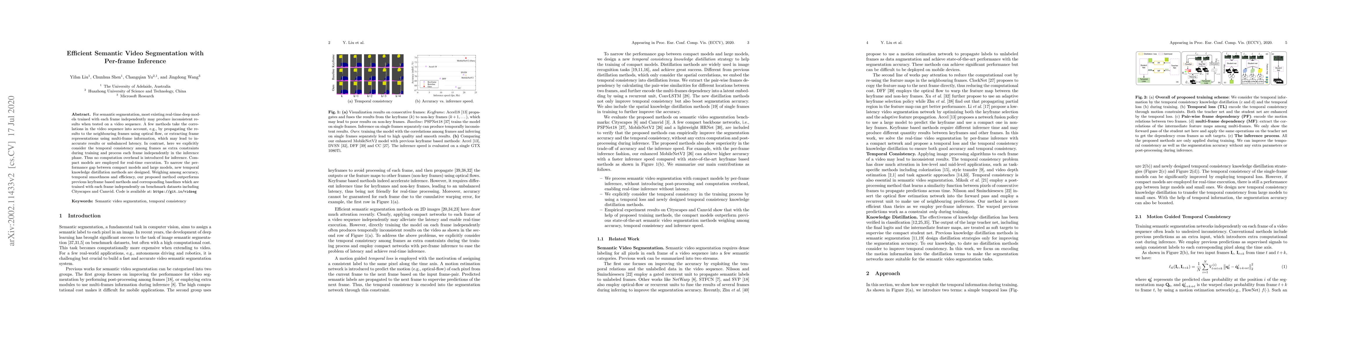 This paper proposes an efficient semantic video segmentation method that processes each frame independently during inference while ensuring temporal consistency through training constraints. The approach achieves high accuracy and speed on benchmarks like Cityscapes and Camvid, outperforming keyframe-based methods.