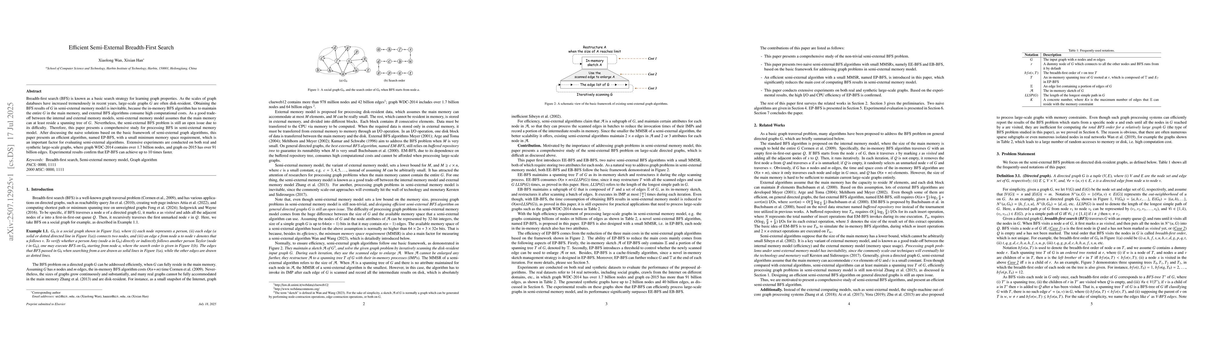 Breadth-first search (BFS) is known as a basic search strategy for learning graph properties. As the scales of graph databases have increased tremendously in recent years, large-scale graphs G are often disk-resident. Obtaining the BFS results of G in semi-external memory model is inevitable, because the in-memory BFS algorithm has to maintain the entire G in the main memory, and external BFS algorithms consume high computational costs. As a good trade-off between the internal and external memory models, semi-external memory model assumes that the main memory can at least reside a spanning tree of G. Nevertheless, the semi-external BFS problem is still an open issue due to its difficulty. Therefore, this paper presents a comprehensive study for processing BFS in semi-external memory model. After discussing the naive solutions based on the basic framework of semi-external graph algorithms, this paper presents an efficient algorithm, named EP-BFS, with a small minimum memory space requirement, which is an important factor for evaluating semi-external algorithms. Extensive experiments are conducted on both real and synthetic large-scale graphs, where graph WDC-2014 contains over 1.7 billion nodes, and graph eu-2015 has over 91 billion edges. Experimental results confirm that EP-BFS can achieve up to 10 times faster.