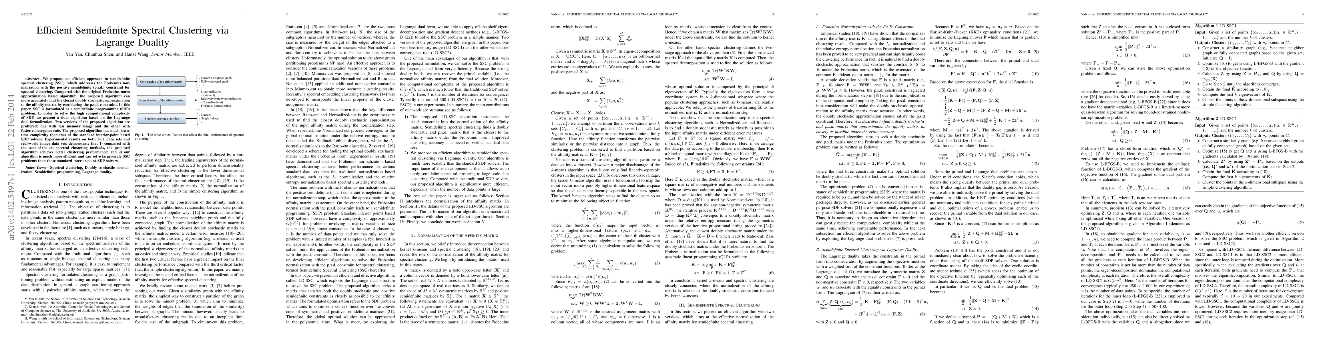 The paper proposes an efficient approach to semidefinite spectral clustering (SSC) via Lagrange duality, formulating SSC as a semidefinite programming (SDP) problem and presenting a dual algorithm based on Lagrange dual formalization to address the high computational complexity of SDP. Two versions of the proposed algorithm are presented: one with less memory usage and the other with a faster convergence rate.