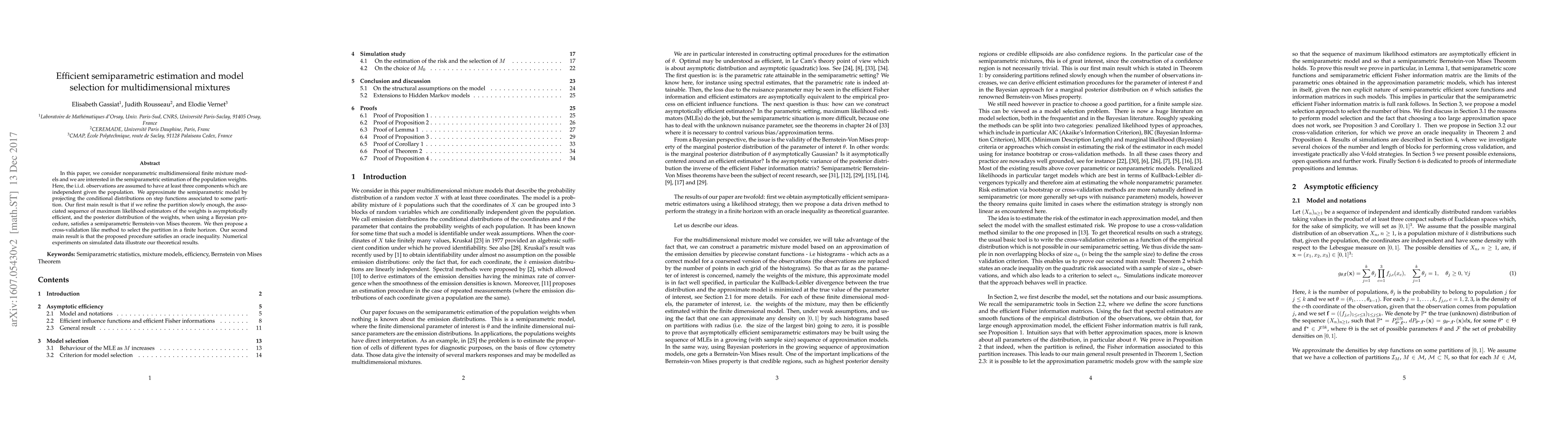 In this paper, we consider nonparametric multidimensional finite mixture models and we are interested in the semiparametric estimation of the population weights. Here, the i.i.d. observations are assumed to have at least three components which are independent given the population. We approximate the semiparametric model by projecting the conditional distributions on step functions associated to some partition. Our first main result is that if we refine the partition slowly enough, the associated sequence of maximum likelihood estimators of the weights is asymptotically efficient, and the posterior distribution of the weights, when using a Bayesian procedure, satisfies a semiparametric Bernstein von Mises theorem. We then propose a cross-validation like procedure to select the partition in a finite horizon. Our second main result is that the proposed procedure satisfies an oracle inequality. Numerical experiments on simulated data illustrate our theoretical results.