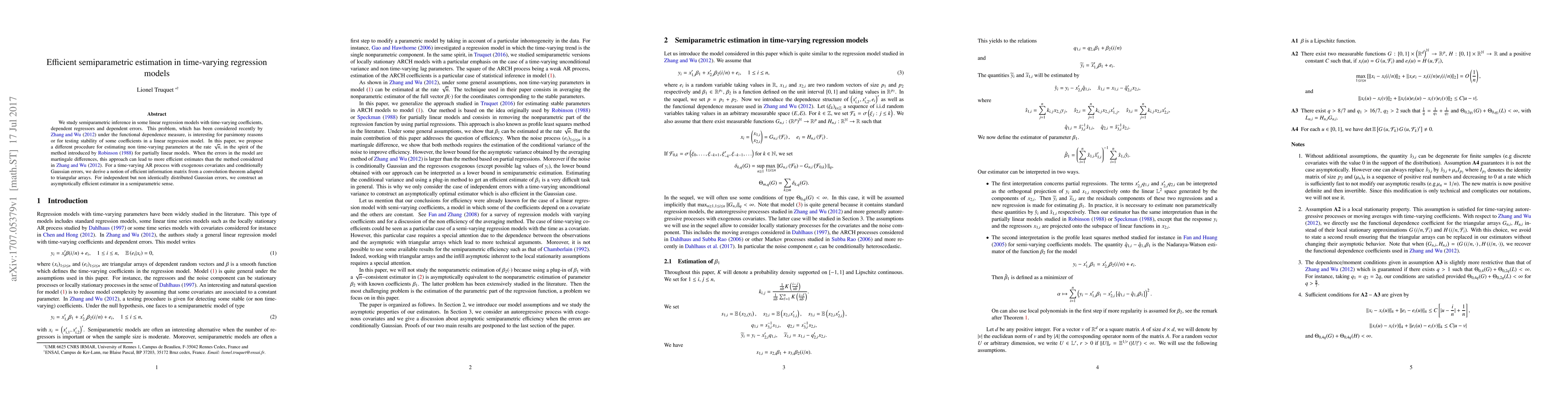 We study semiparametric inference in some linear regression models with time-varying coefficients, dependent regressors and dependent errors. This problem, which has been considered recently by Zhang and Wu (2012) under the functional dependence measure, is interesting for parsimony reasons or for testing stability of some coefficients in a linear regression model. In this paper, we propose a different procedure for estimating non time-varying parameters at the rate root n, in the spirit of the method introduced by Robinson (1988) for partially linear models. When the errors in the model are martingale differences, this approach can lead to more effcient estimates than the method considered in Zhang and Wu (2012). For a time-varying AR process with exogenous covariates and conditionally Gaussian errors, we derive a notion of efficient information matrix from a convolution theorem adapted to triangular arrays. For independent but non identically distributed Gaussian errors, we construct an asymptotically efficient estimator in a semiparametric sense.