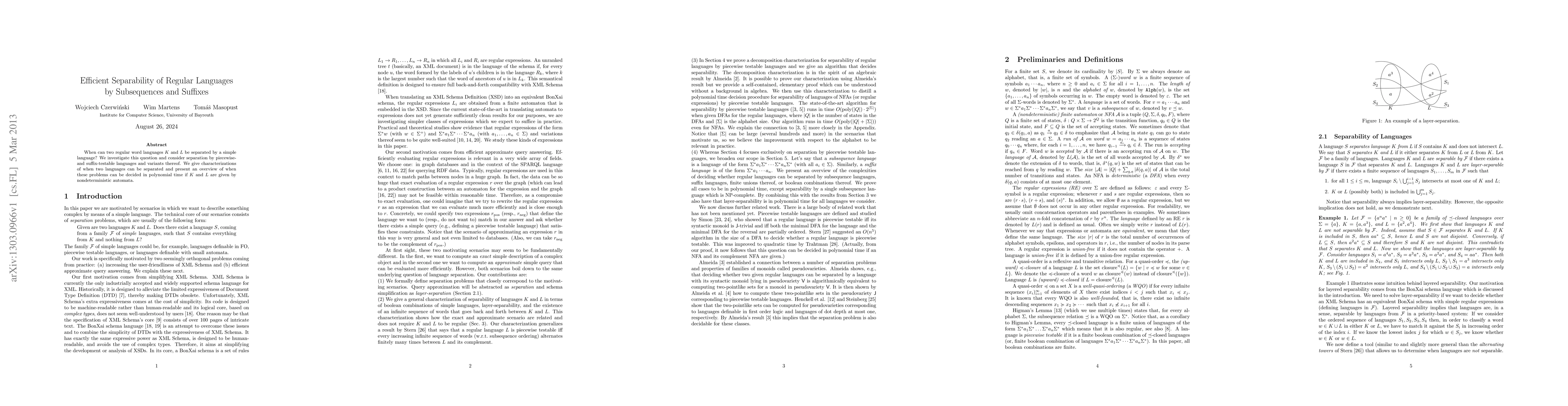 This paper investigates whether two regular word languages can be separated by a simple language, focusing on piecewise- and suffix-testable languages. It provides characterizations of when separation is possible in polynomial time using nondeterministic automata.