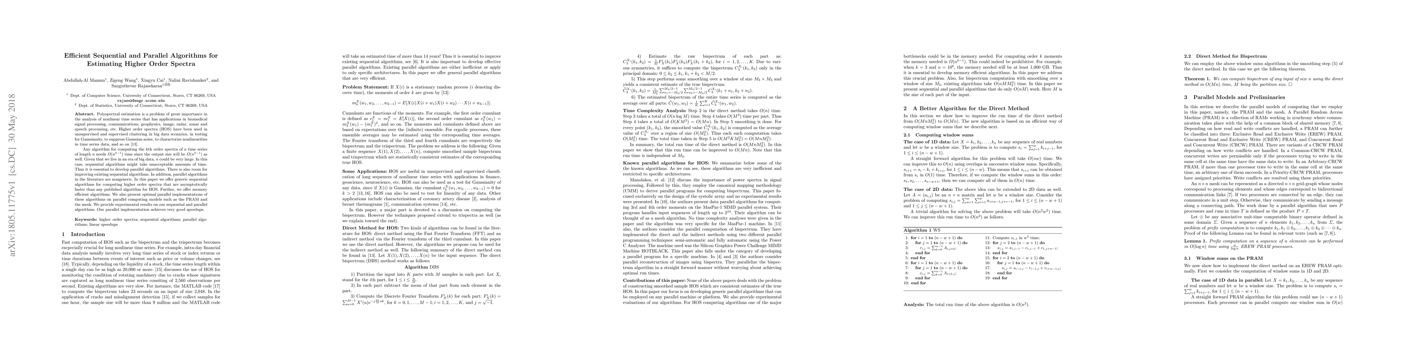 Polyspectral estimation is a problem of great importance in the analysis of nonlinear time series that has applications in biomedical signal processing, communications, geophysics, image, radar, sonar and speech processing, etc. Higher order spectra (HOS) have been used in unsupervised and supervised clustering in big data scenarios, in testing for Gaussianity, to suppress Gaussian noise, to characterize nonlinearities in time series data, and so on . Any algorithm for computing the $k$th order spectra of a time series of length $n$ needs $\Omega(n^{k-1})$ time since the output size will be $\Omega(n^{k-1})$ as well. Given that we live in an era of big data, $n$ could be very large. In this case, sequential algorithms might take unacceptable amounts of time. Thus it is essential to develop parallel algorithms. There is also room for improving existing sequential algorithms. In addition, parallel algorithms in the literature are nongeneric. In this paper we offer generic sequential algorithms for computing higher order spectra that are asymptotically faster than any published algorithm for HOS. Further, we offer memory efficient algorithms. We also present optimal parallel implementations of these algorithms on parallel computing models such as the PRAM and the mesh. We provide experimental results on our sequential and parallel algorithms. Our parallel implementation achieves very good speedups.