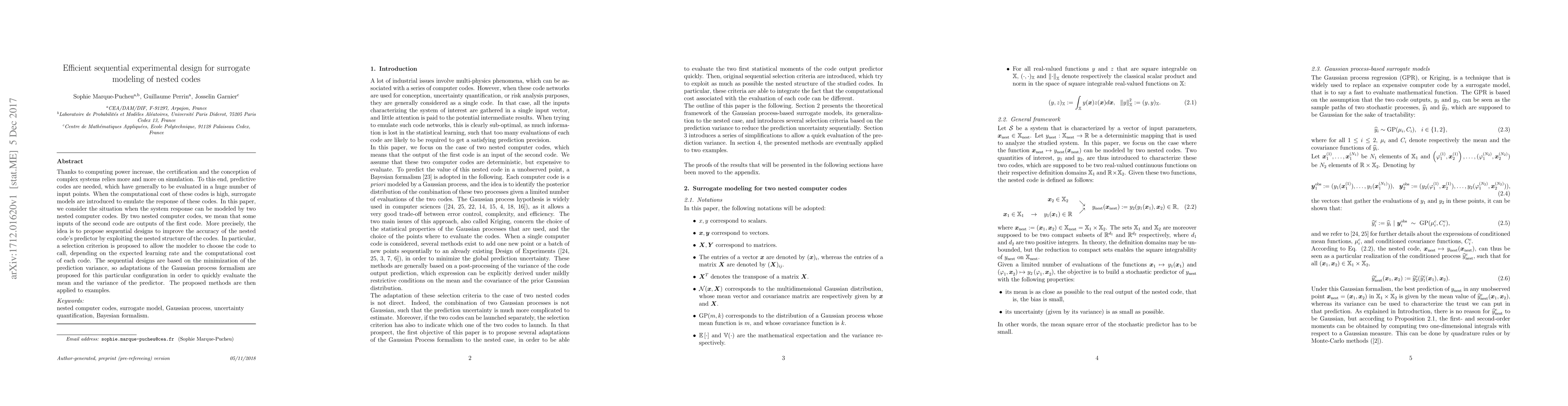 This paper proposes a sequential experimental design to improve accuracy in surrogate modeling of nested codes, reducing computational cost and increasing efficiency.