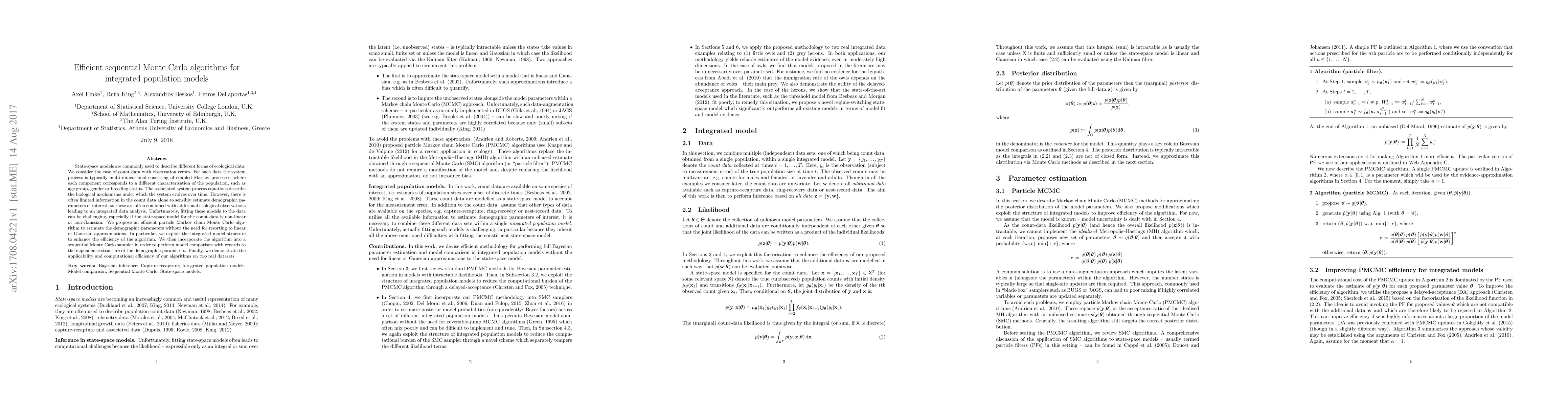 This paper proposes an efficient particle Markov chain Monte Carlo algorithm for estimating demographic parameters in state-space models of ecological count data, especially when the models are non-linear or non-Gaussian. The authors enhance the algorithm's efficiency through the integrated model structure and demonstrate its application and effectiveness on real datasets.