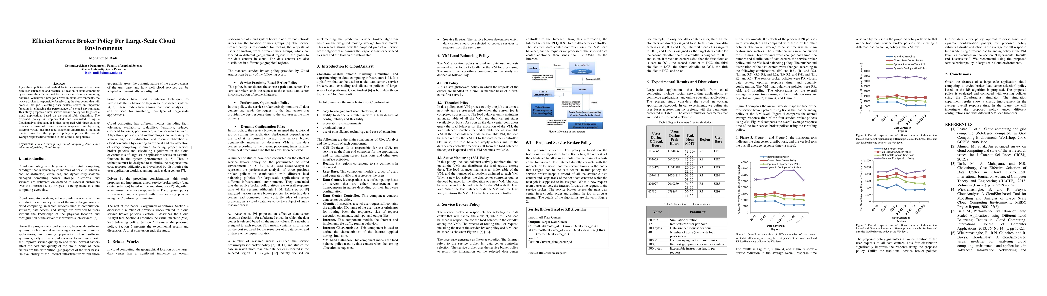 This study proposes an efficient service broker policy based on the round-robin algorithm for large-scale cloud environments, aiming to enhance performance through better resource allocation. Simulation results show that the new policy outperforms three existing ones in reducing overall average response time.