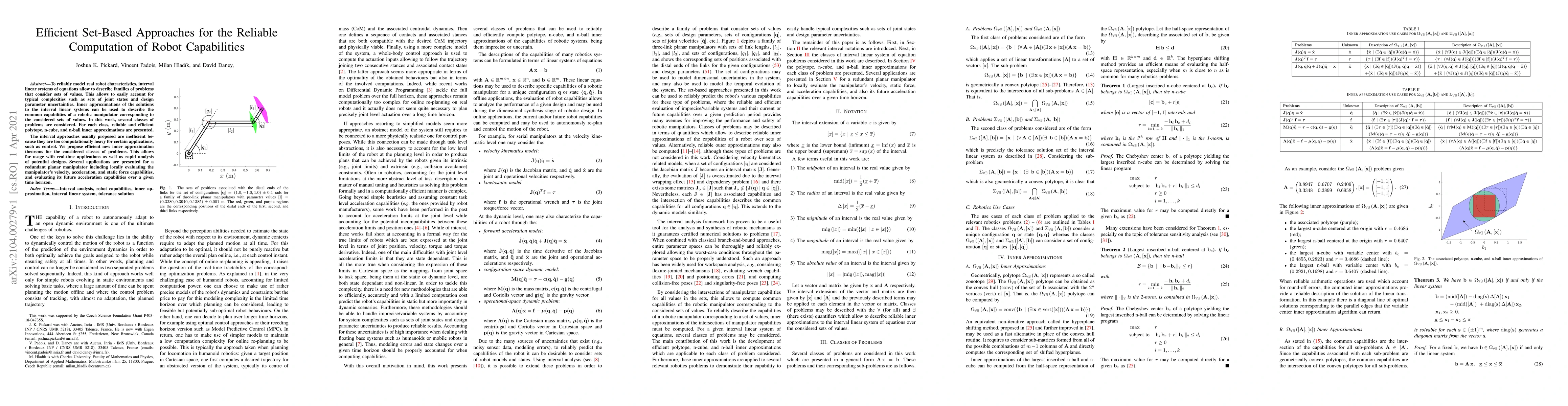 To reliably model real robot characteristics, interval linear systems of equations allow to describe families of problems that consider sets of values. This allows to easily account for typical complexities such as sets of joint states and design parameter uncertainties. Inner approximations of the solutions to the interval linear systems can be used to describe the common capabilities of a robotic manipulator corresponding to the considered sets of values. In this work, several classes of problems are considered. For each class, reliable and efficient polytope, n-cube, and n-ball inner approximations are presented. The interval approaches usually proposed are inefficient because they are too computationally heavy for certain applications, such as control. We propose efficient new inner approximation theorems for the considered classes of problems. This allows for usage with real-time applications as well as rapid analysis of potential designs. Several applications are presented for a redundant planar manipulator including locally evaluating the manipulator's velocity, acceleration, and static force capabilities, and evaluating its future acceleration capabilities over a given time horizon.