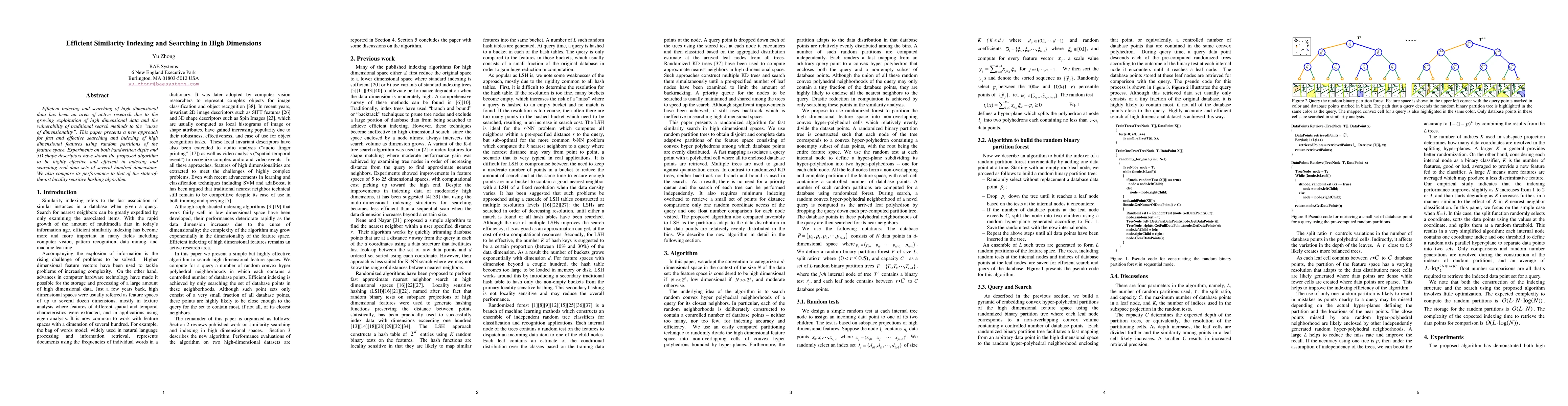 This paper introduces a novel method for efficient indexing and searching of high-dimensional data using random partitions, demonstrating superior performance over state-of-the-art locality sensitive hashing on datasets with hundreds of dimensions. Experimental results on handwritten digits and 3-D shape descriptors validate its effectiveness.