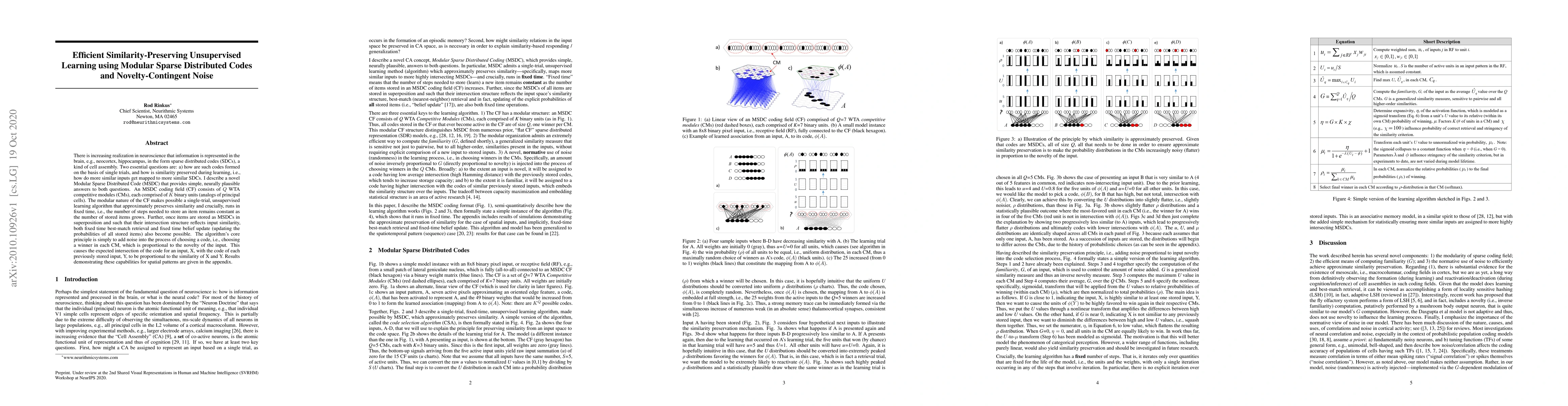 The research introduces Modular Sparse Distributed Codes (MSDCs) for unsupervised learning, mimicking the brain's information representation. MSDCs use a modular coding field with competitive modules, enabling single-trial learning that preserves similarity and operates in constant time. Novelty-contingent noise is key, ensuring similar inputs map to similar codes, facilitating fixed-time retrieval and belief update.