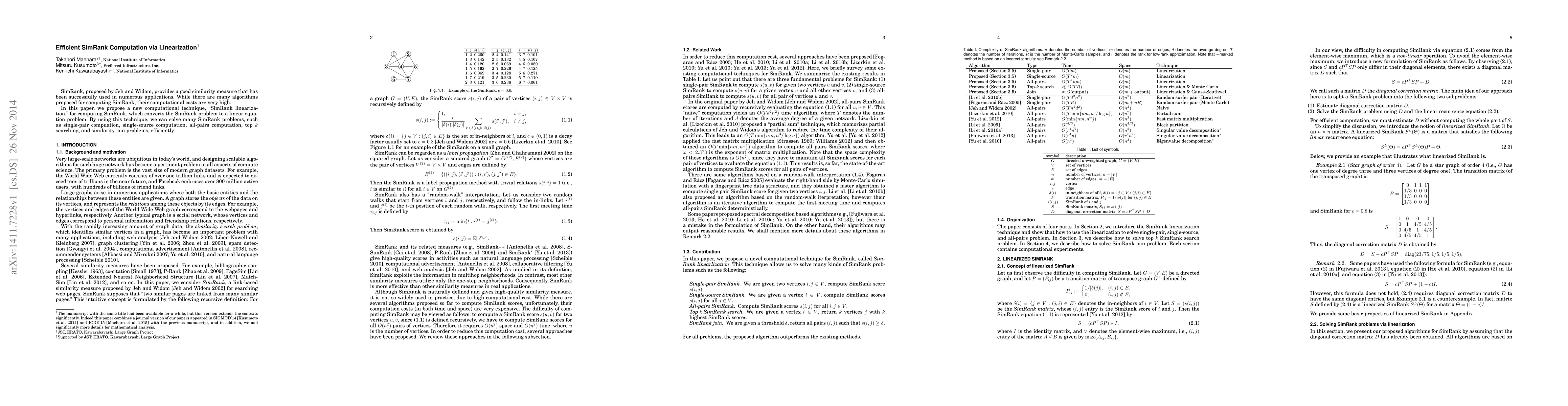 This paper introduces a novel "SimRank linearization" technique to efficiently compute SimRank, transforming the problem into a linear equation, thereby reducing computational costs for various SimRank applications including single-pair, single-source, all-pairs computations, top k searching, and similarity join.