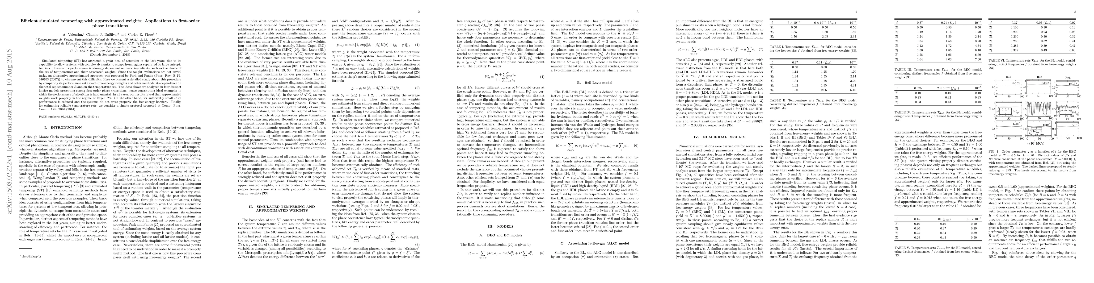 This study examines an approximated method for simulated tempering in lattice models with strong first-order phase transitions, comparing it to exact weights and other methods. Results indicate the approximated weights effectively work with larger replica numbers but struggle with smaller ones, and a protocol from 2014 is suggested for estimating temperature sets.