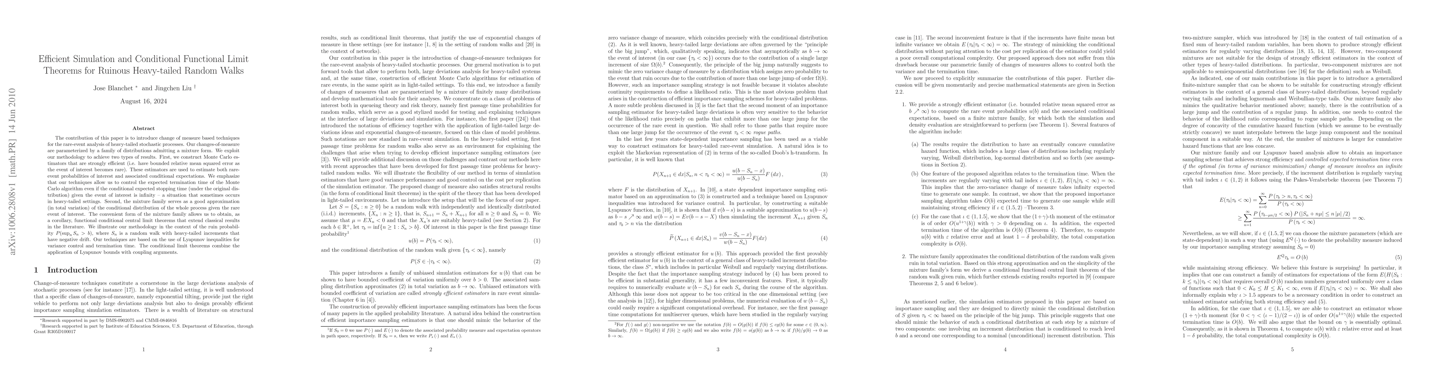 This paper introduces change-of-measure techniques for analyzing heavy-tailed stochastic processes, specifically focusing on rare-event scenarios. It constructs Monte Carlo estimators that efficiently estimate rare-event probabilities and conditional expectations, even when the original stopping time is infinite. Additionally, it provides functional conditional central limit theorems as a corollary, extending classical results and demonstrating the methodology through ruin probability analysis of heavy-tailed random walks.