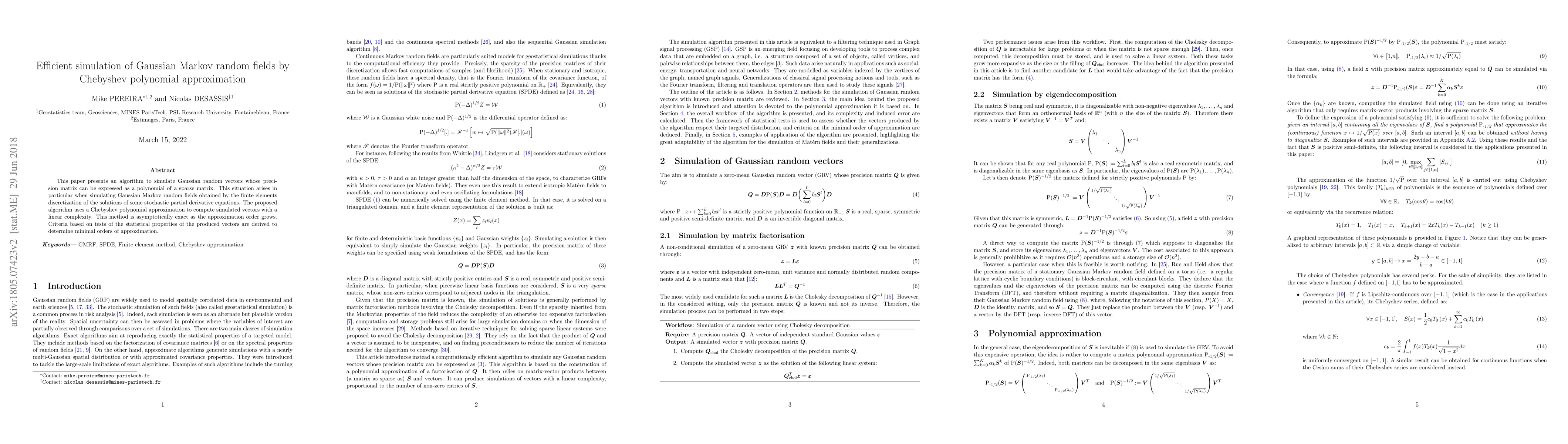 The paper presents an algorithm for simulating Gaussian random vectors with precision matrices expressible as a polynomial of a sparse matrix, specifically targeting Gaussian Markov random fields from finite element discretizations of stochastic partial differential equations.