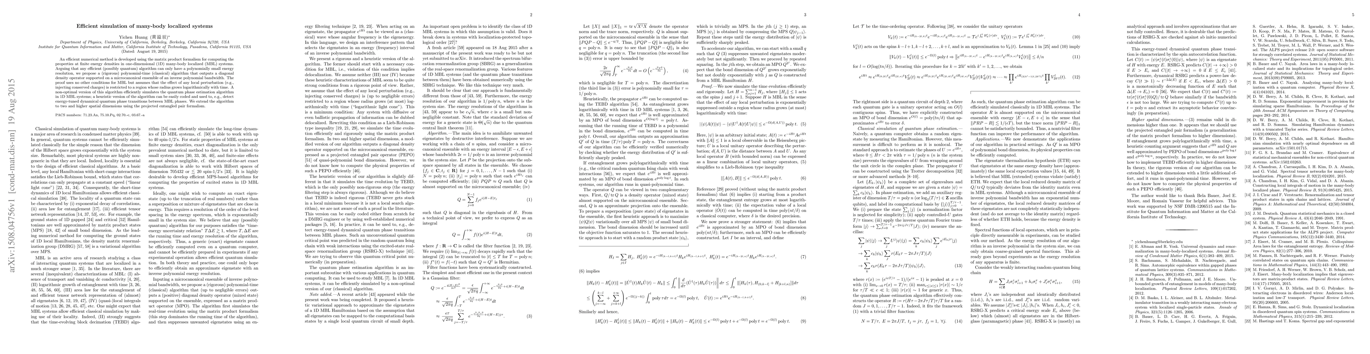 This paper develops a polynomial-time classical algorithm for simulating properties of one-dimensional many-body localized systems using matrix product formalism, and extends it to higher dimensions. The method detects dynamical quantum phase transitions and operates under the assumption that local perturbations affect a region growing logarithmically with time.