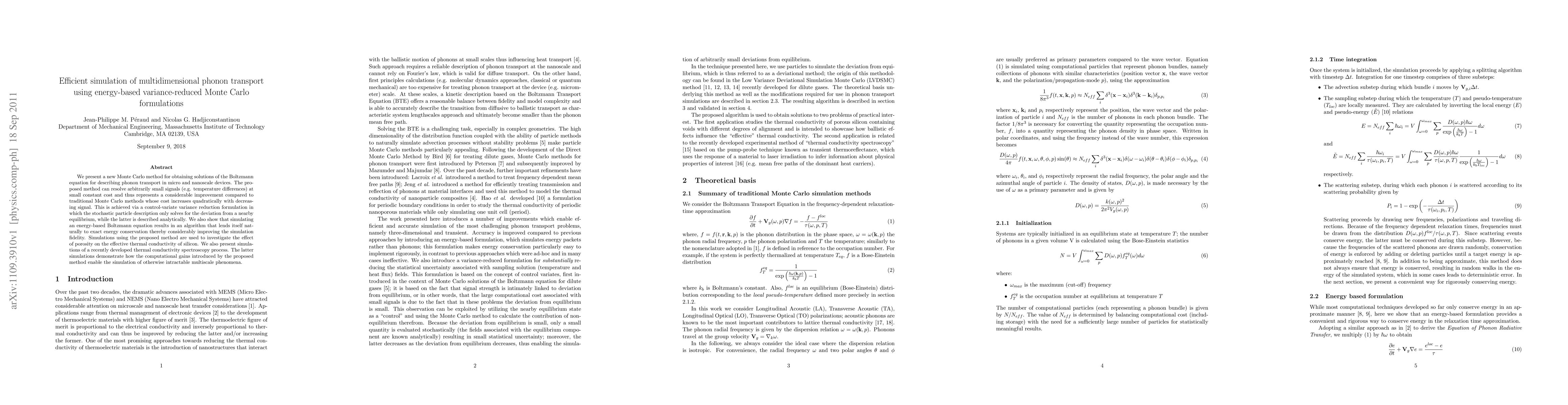 This paper introduces an advanced Monte Carlo method for phonon transport simulation, achieving constant computational cost for small signals and exact energy conservation. The method's efficiency enables simulations of complex multiscale phenomena, such as the effect of porosity on silicon's thermal conductivity.