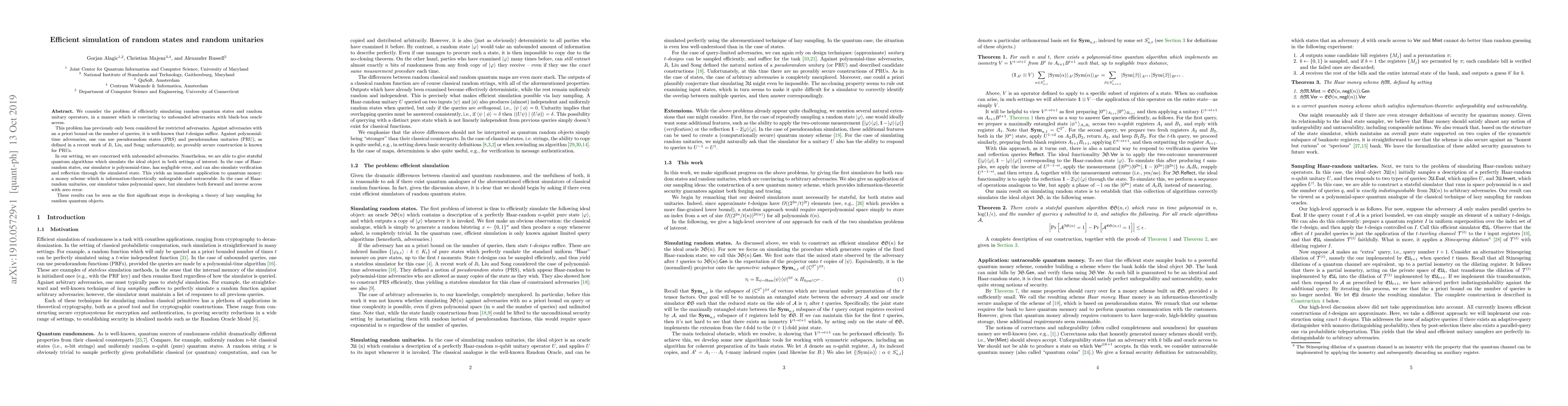 This paper presents efficient quantum algorithms to simulate Haar-random quantum states and unitaries for unbounded adversaries, achieving negligible error and zero error respectively. The results enable the development of information-theoretically secure quantum money schemes.