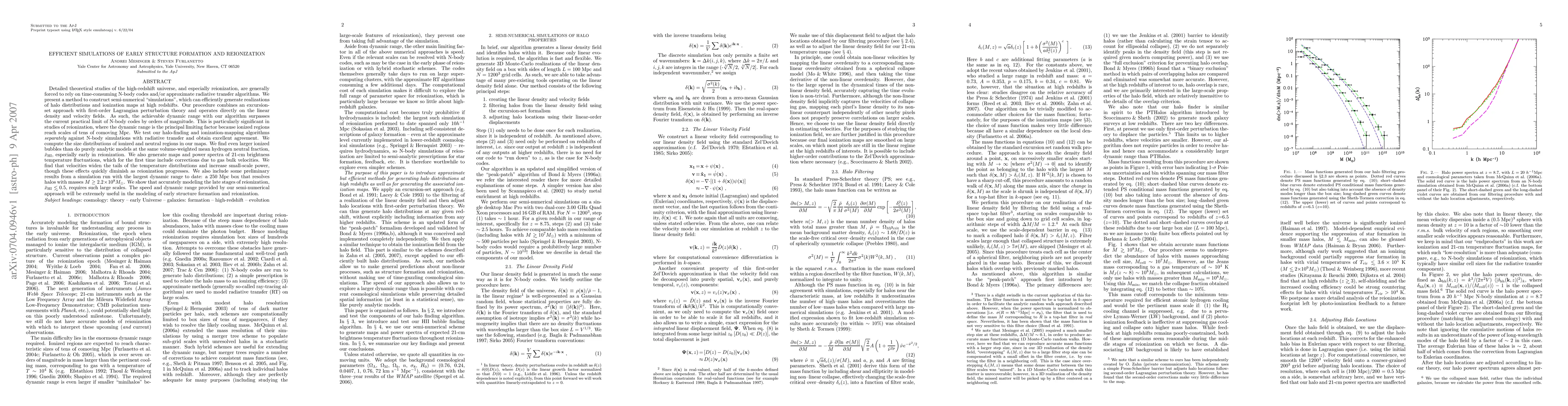 We present a method to construct semi-numerical ``simulations'', which can efficiently generate realizations of halo distributions and ionization maps at high redshifts. Our procedure combines an excursion-set approach with first-order Lagrangian perturbation theory and operates directly on the linear density and velocity fields. As such, the achievable dynamic range with our algorithm surpasses the current practical limit of N-body codes by orders of magnitude. This is particularly significant in studies of reionization, where the dynamic range is the principal limiting factor. We test our halo-finding and HII bubble-finding algorithms independently against N-body simulations with radiative transfer and obtain excellent agreement. We compute the size distributions of ionized and neutral regions in our maps. We find even larger ionized bubbles than do purely analytic models at the same volume-weighted mean hydrogen neutral fraction. We also generate maps and power spectra of 21-cm brightness temperature fluctuations, which for the first time include corrections due to gas bulk velocities. We find that velocities widen the tails of the temperature distributions and increase small-scale power, though these effects quickly diminish as reionization progresses. We also include some preliminary results from a simulation run with the largest dynamic range to date: a 250 Mpc box that resolves halos with masses M >~ 2.2 x10^8 M_sun. We show that accurately modeling the late stages of reionization requires such large scales. The speed and dynamic range provided by our semi-numerical approach will be extremely useful in the modeling of early structure formation and reionization.