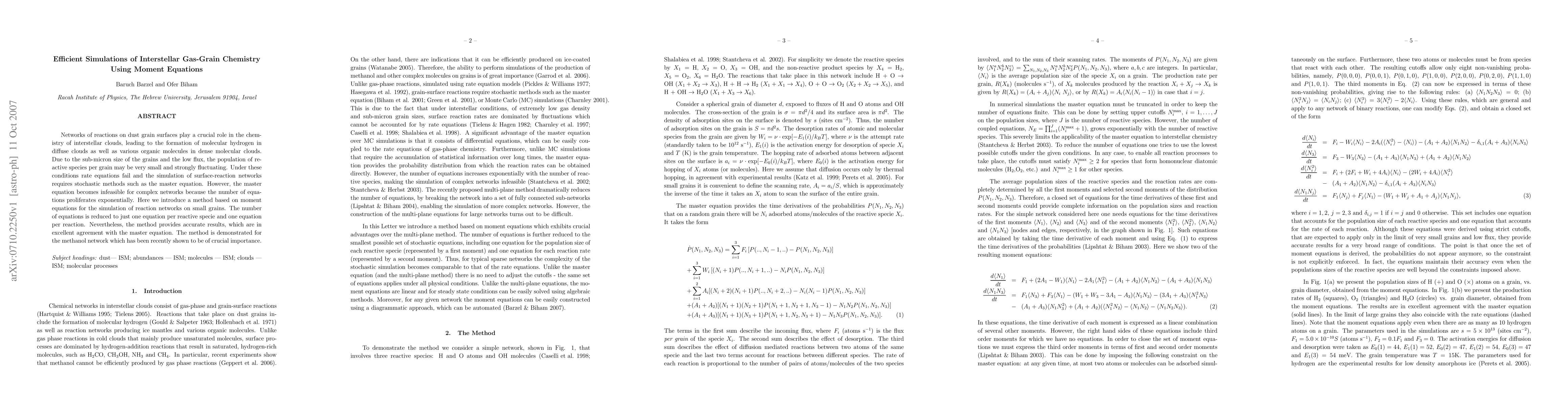 This paper introduces a moment-equation method for efficiently simulating interstellar gas-grain chemistry on small dust grains, reducing computational complexity while maintaining accuracy comparable to the stochastic master equation. The method is demonstrated for the methanol reaction network, showing its potential for complex reaction networks.