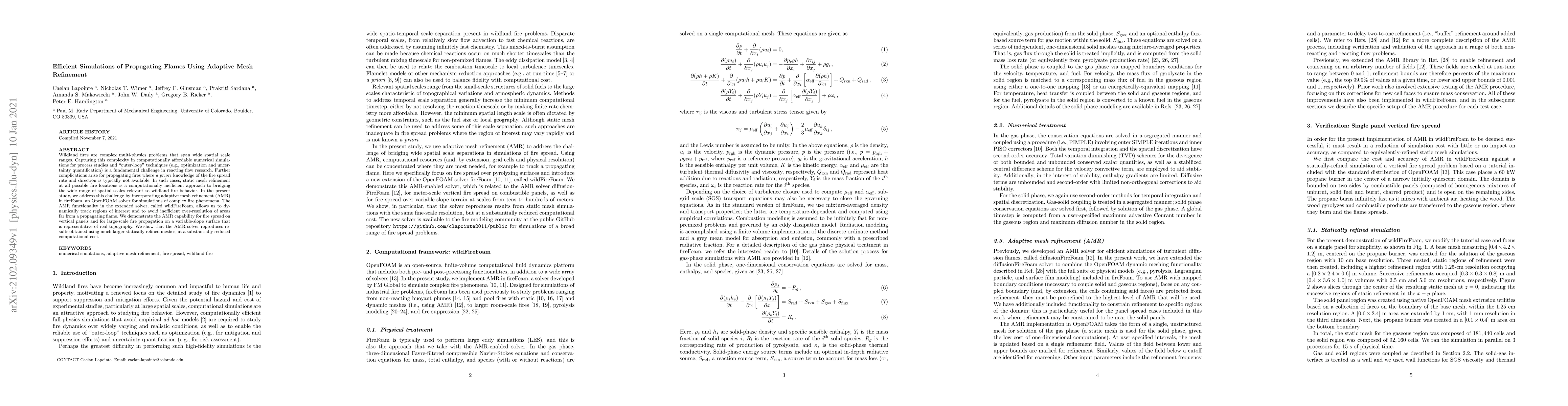 This paper introduces adaptive mesh refinement (AMR) in wildFireFoam to efficiently simulate propagating wildland fires, dynamically focusing computational resources on regions of interest and reducing costs compared to statically refined meshes. The AMR approach demonstrates accurate results for fire spread on vertical panels and large-scale fire propagation on variable-slope surfaces.
