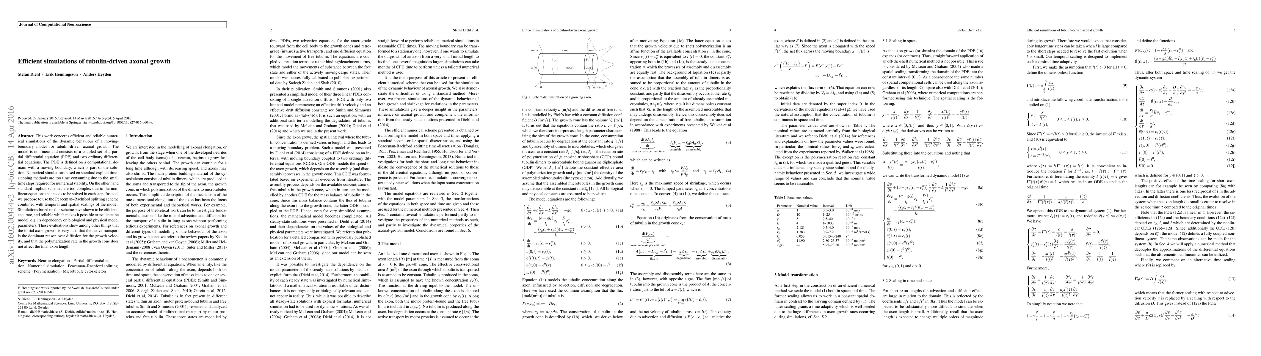 This work concerns efficient and reliable numerical simulations of the dynamic behaviour of a moving-boundary model for tubulin-driven axonal growth. The model is nonlinear and consists of a coupled set of a partial differential equation (PDE) and two ordinary differential equations. The PDE is defined on a computational domain with a moving boundary, which is part of the solution. Numerical simulations based on standard explicit time-stepping methods are too time consuming due to the small time steps required for numerical stability. On the other hand standard implicit schemes are too complex due to the nonlinear equations that needs to be solved in each step. Instead, we propose to use the Peaceman--Rachford splitting scheme combined with temporal and spatial scalings of the model. Simulations based on this scheme have shown to be efficient, accurate, and reliable which makes it possible to evaluate the model, e.g.\ its dependency on biological and physical model parameters. These evaluations show among other things that the initial axon growth is very fast, that the active transport is the dominant reason over diffusion for the growth velocity, and that the polymerization rate in the growth cone does not affect the final axon length.