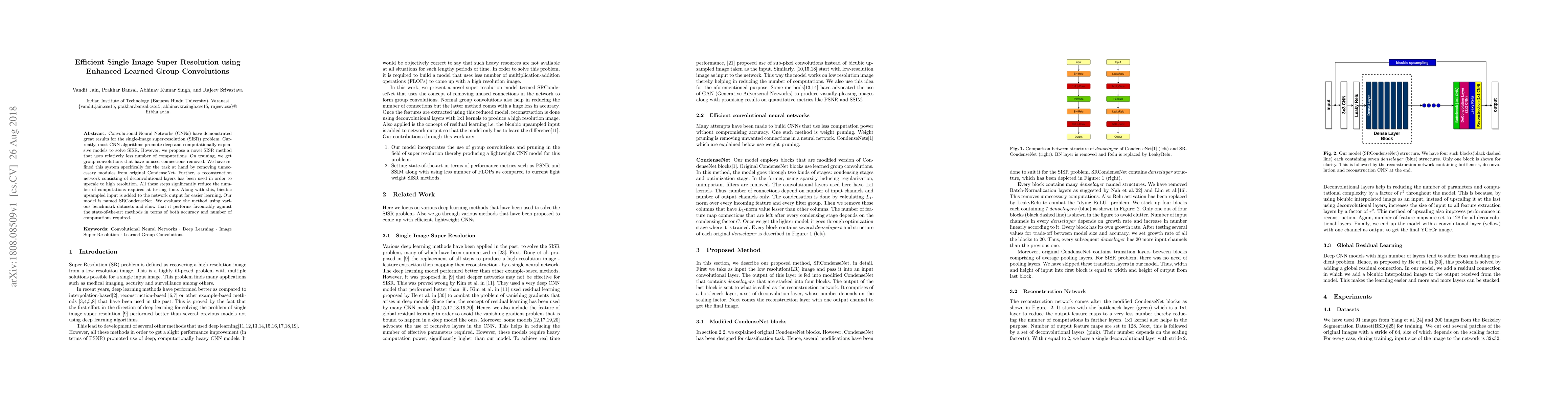 This paper proposes SRCondenseNet, a novel method for efficient single-image super-resolution using enhanced learned group convolutions. The model reduces computational load by refining CondenseNet and incorporating a deconvolutional reconstruction network, achieving competitive accuracy with fewer computations.