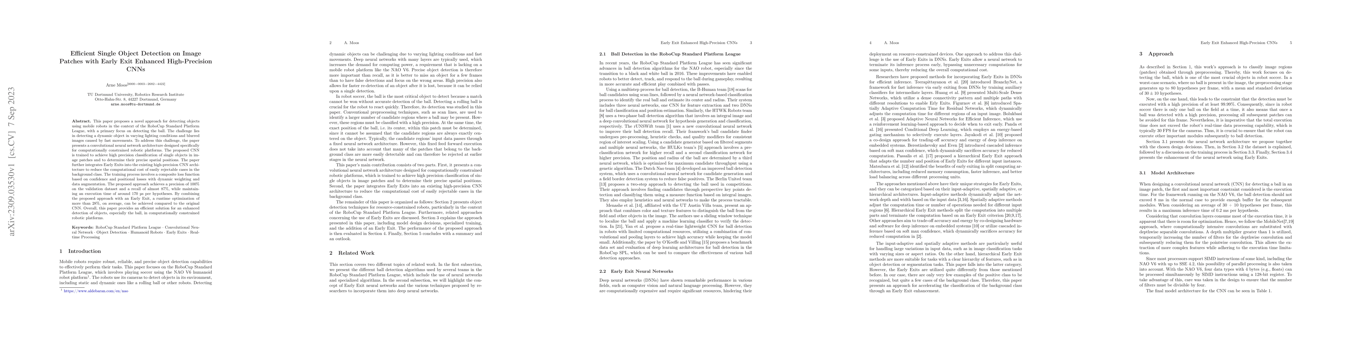 The paper proposes a CNN architecture optimized for mobile robots in RoboCup Standard Platform League, focusing on ball detection with high precision and real-time processing. It incorporates Early Exits to reduce computational cost for easily rejectable background cases.