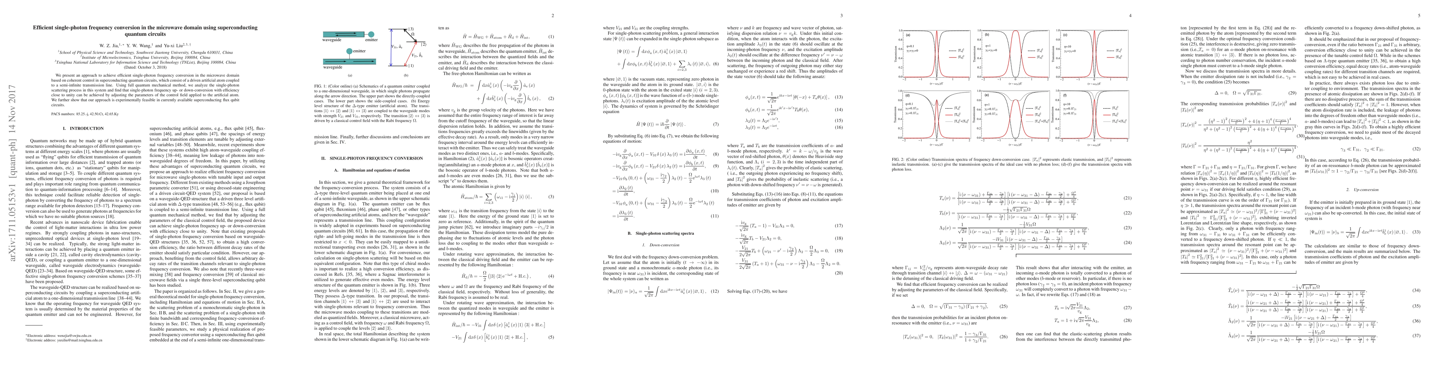 This paper proposes an efficient method for single-photon frequency conversion in the microwave domain using superconducting quantum circuits, achieving nearly perfect conversion efficiency through coherent control. The approach is shown to be feasible with current superconducting flux qubit circuits.